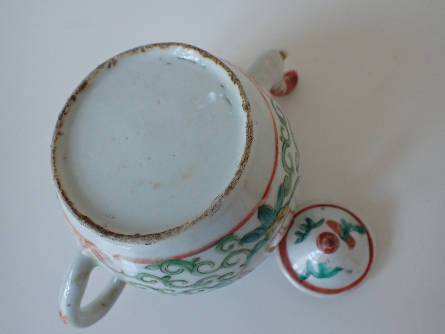 Kinesisk te-/sakekande med skrifttegn og sommerfugle. Tao Kuang (1821 - 1850). Family Rose dekoration. Højde med låg: 10,2 cm. I pæn tidstypisk stand uden skår.