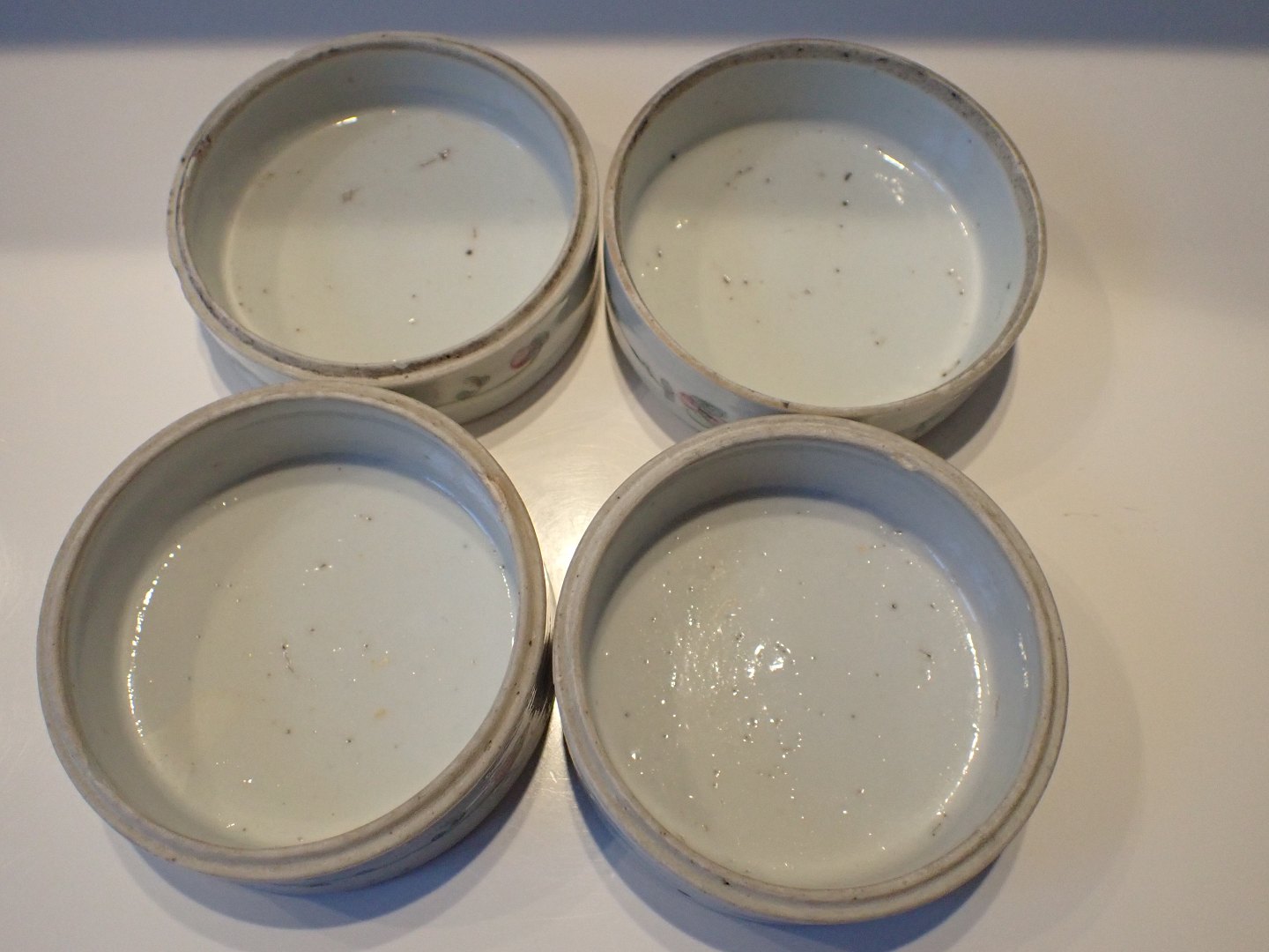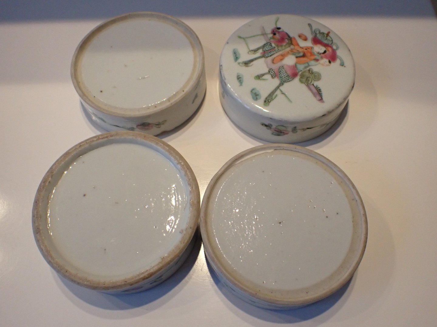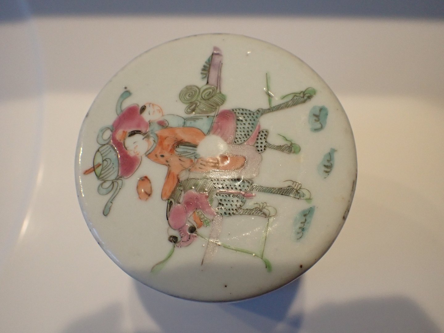 Firedelt kinesisk sminkedåse i porcelæn, Quing slut 1800-tallet. Dekoret med emaljefarver med blomsterranker og insekter. På låget en scene med små mennesker der rider på et stort incekt (måske en cikade). Lidt brændingsfel på et lag og et ubetydeligt afslag på kanten. Ellers i fin stand i forhold til alder. Højde: 11 cm. Diameter: 8 cm.