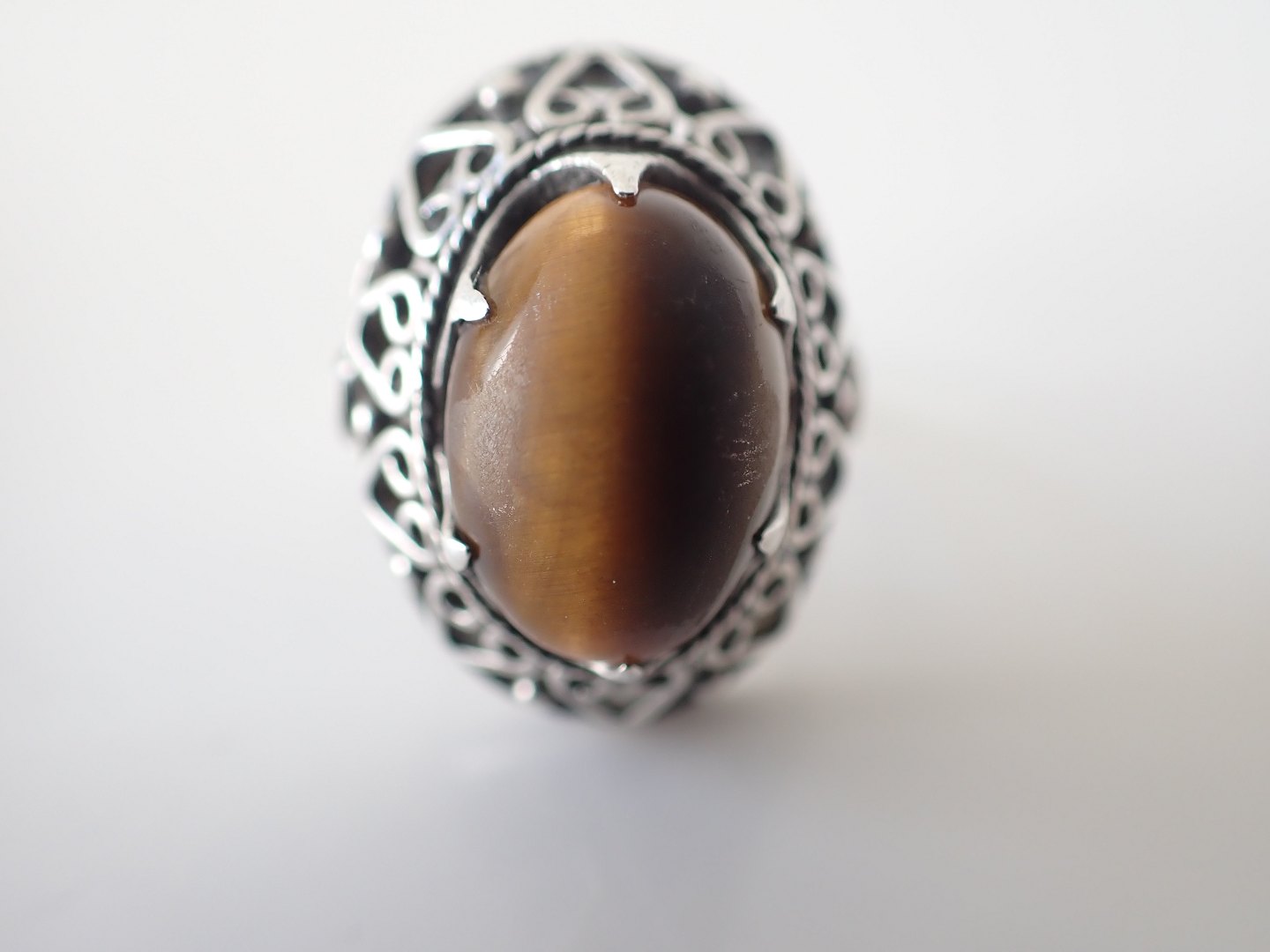 En sterling sølvring med carbochon sleben tigersten. Stempel 925. Ringstørrelse (åben): 56. Pæn med noget brugsslid på sten.
