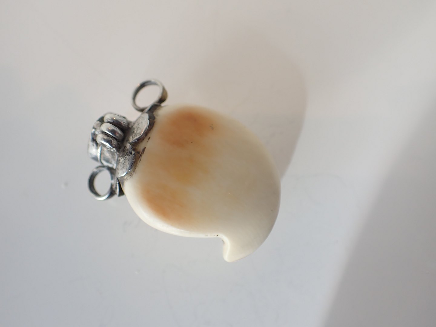 Til venstre: Meget lille, orientalsk, parfumeflaske i ben med sølvmontering (ustemplet). Højde. 3,3 cm. Pris: 175 kr.