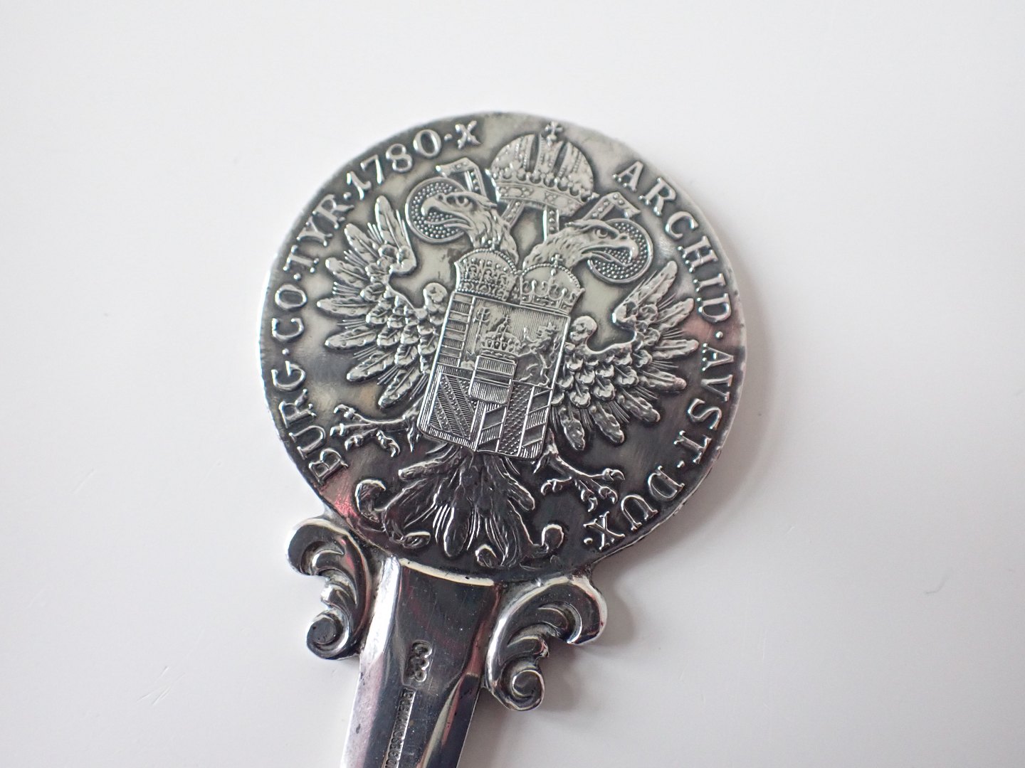 En østrigsk brevkniv med Maria Theresia (1717 - 1780) sølvdaler udført 1780, men ucirkuleret på grund af hendes død (0.9%, isoleret vægt 23,4 g.) - sammensat med en brevkniv i 800 sølv stemplet med mestermærke og "handgesmiedet". Mønt og kniv er i god stand. Samlet længde: 18,5 cm. Diameter mønt: 4 cm. Samlet vægt: 45,7 gram. Pris: 700 kr.