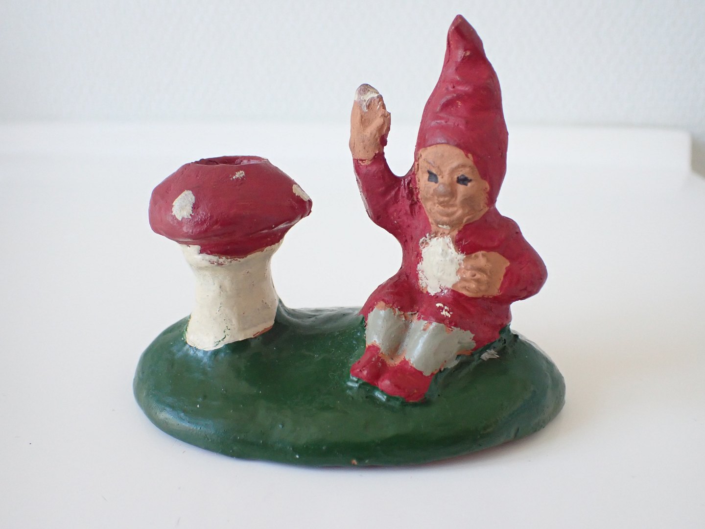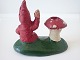 To terrakotta nisser. En der sidder ved en paddehat som kan anvendes til lys. En anden der ligger med en lyseholder. Ret primitivt lavet og håndmalet. Oprindelse ukendt. Ca. 1950. Højde: 5 og 8 cm. Bredde: 9 og 9,5 cm. I pæn stand.