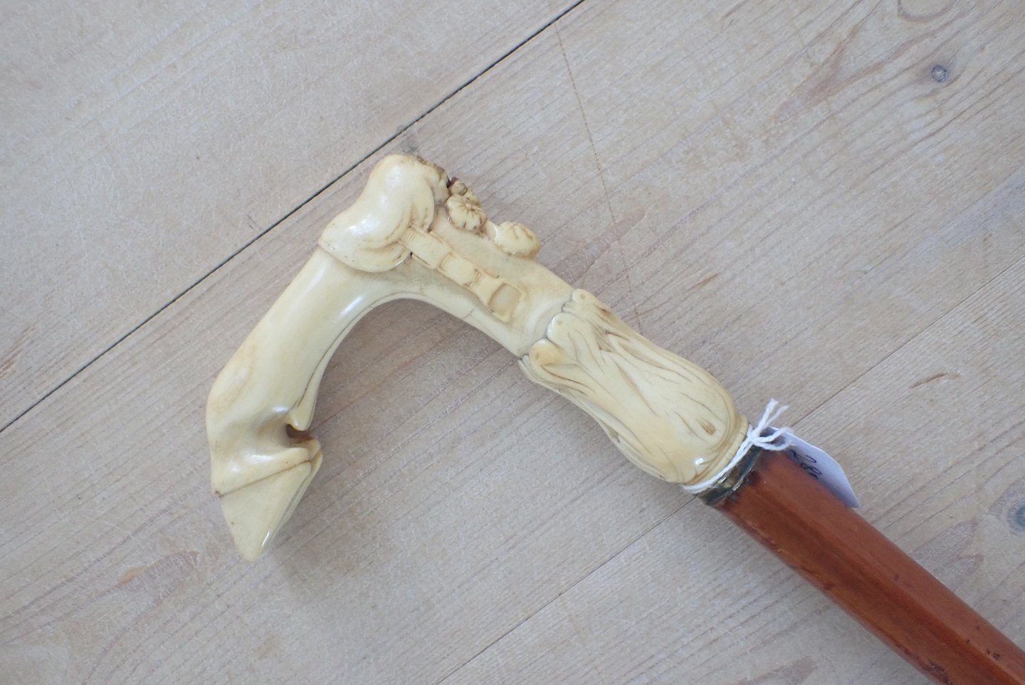 Stok med greb af udskåret elfenben i form af et hesteben sat med metal på en malakkastok med dupsko af gummi. Engelsk? ca. 1880. Længde. 82,7 cm. Sælges med Cites-certifikat. Pæn med tidstypisk slid.