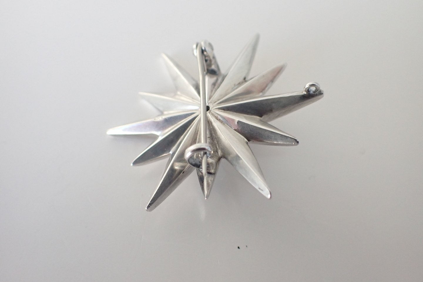12 takket stjernebroche/ophæng i 900sølv med talrige diamantslebne zirkoner. Stemplet 900. Vægt 10 gram. Største diameter: 4 cm. I fin stand.