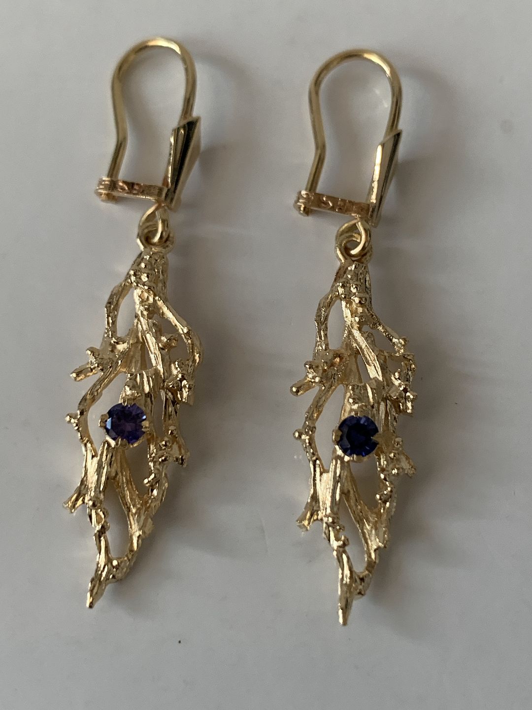 Gold earrings in 14 carat gold, with purple stones and stamped 585 HS