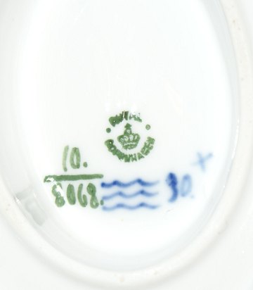 Kongelig Blå Blomst Flettet, Sauceskål på fast fad. Dekorationsnummer #8068 Modellør: J.Jakobsen Februar 1903 Produceret før 1923 2.Sortering Længde 17 cm. Højde 12 cm. Pæn og velholdt stand