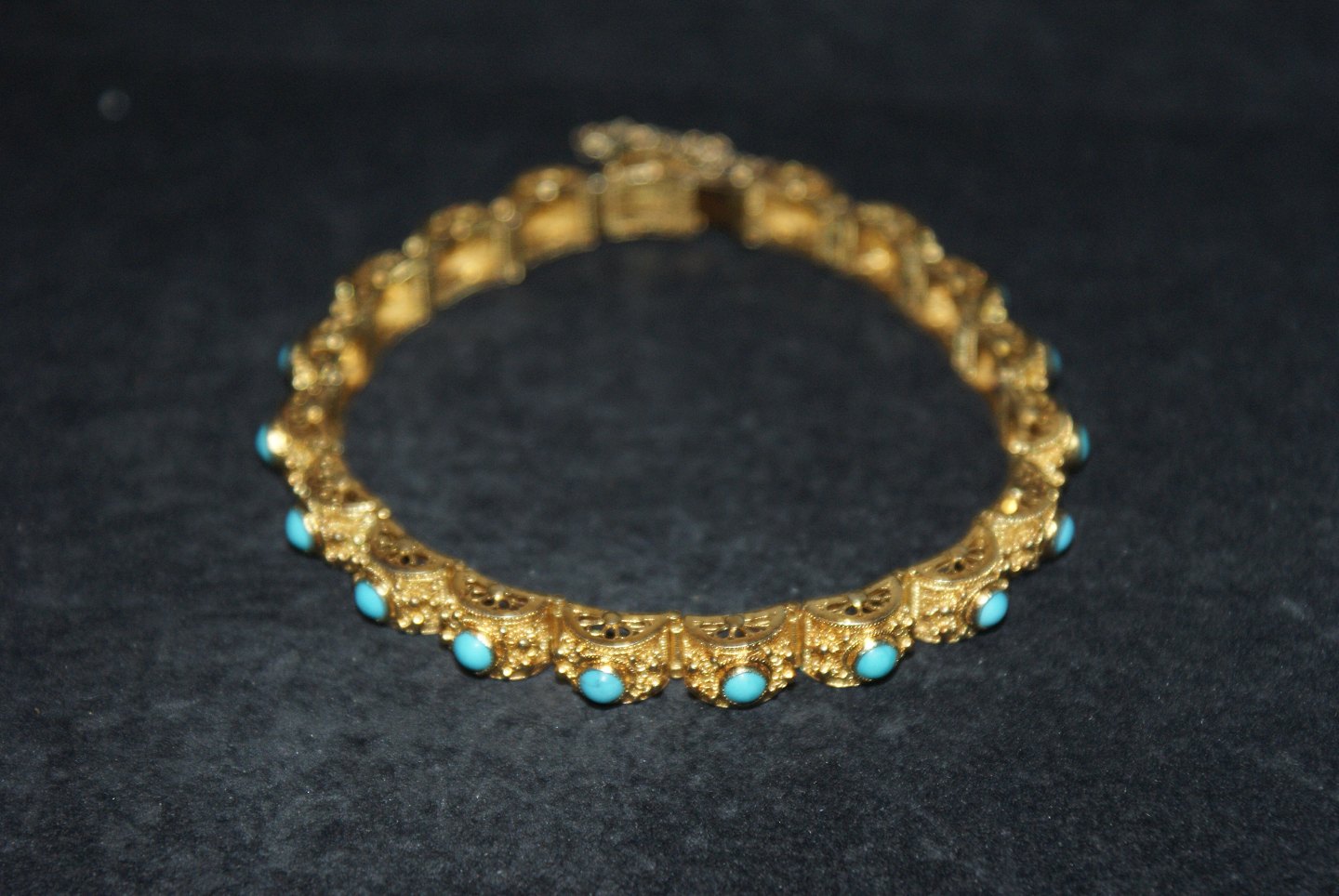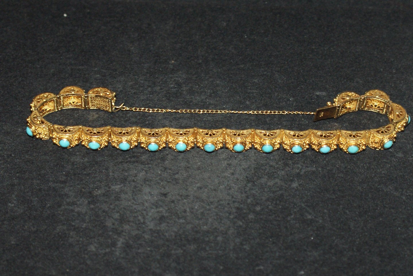 Bracelet with Turquoise, Gold 14 karat Stamped: 585, 14K, Length 17.5 cm. Width 7 mm. Thickness 6.7 mm. The jewel checked by jeweler The item is not physically in the store. Contact us for presentation