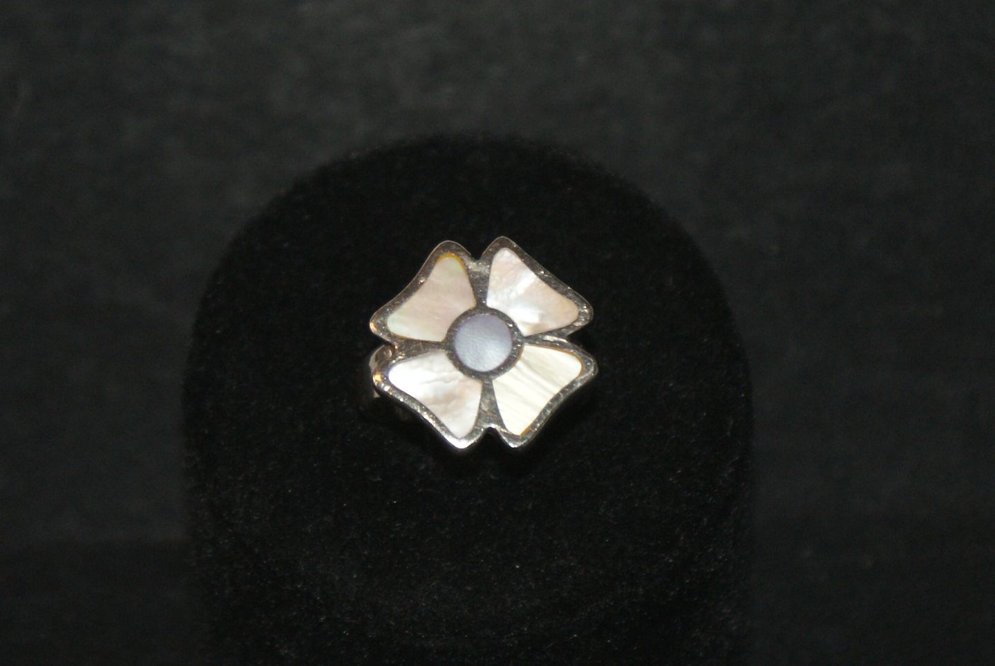 Firkløverring med perlemor, Sterling sølv Stemplet: 925 Størrelse 57, 18,14 mm. Flot og velholdt. Se også vor anden website: http://www.antik-huset.dk/produkter/smykker.html
