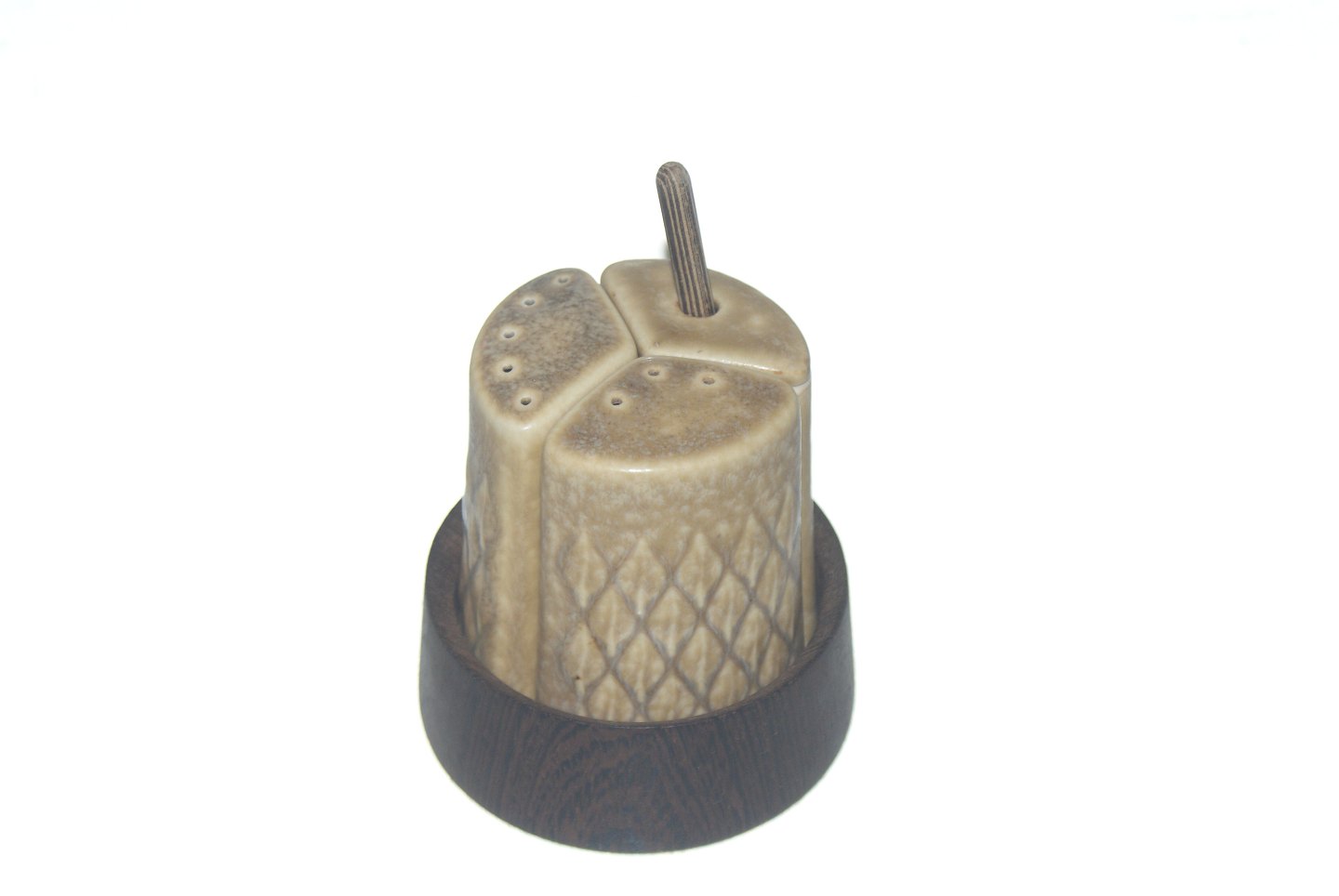 Bing & Grondahl/Nissen/Kronjyden, Relief stoneware, salt shaker, pepper shaker and mustard jar in wooden bowl Designed by Jens Harald Quistgaard. Height 8.5 cm. Perfect condition.