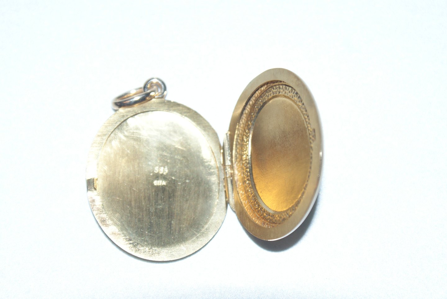 Medaljion i 14 karat guld Stemplet 585 GIF Højde 52,10 mm Brede 33,19 mm Tykkelse 6,70 mm Pæn og velholdt stand Smykket checket af guldsmed