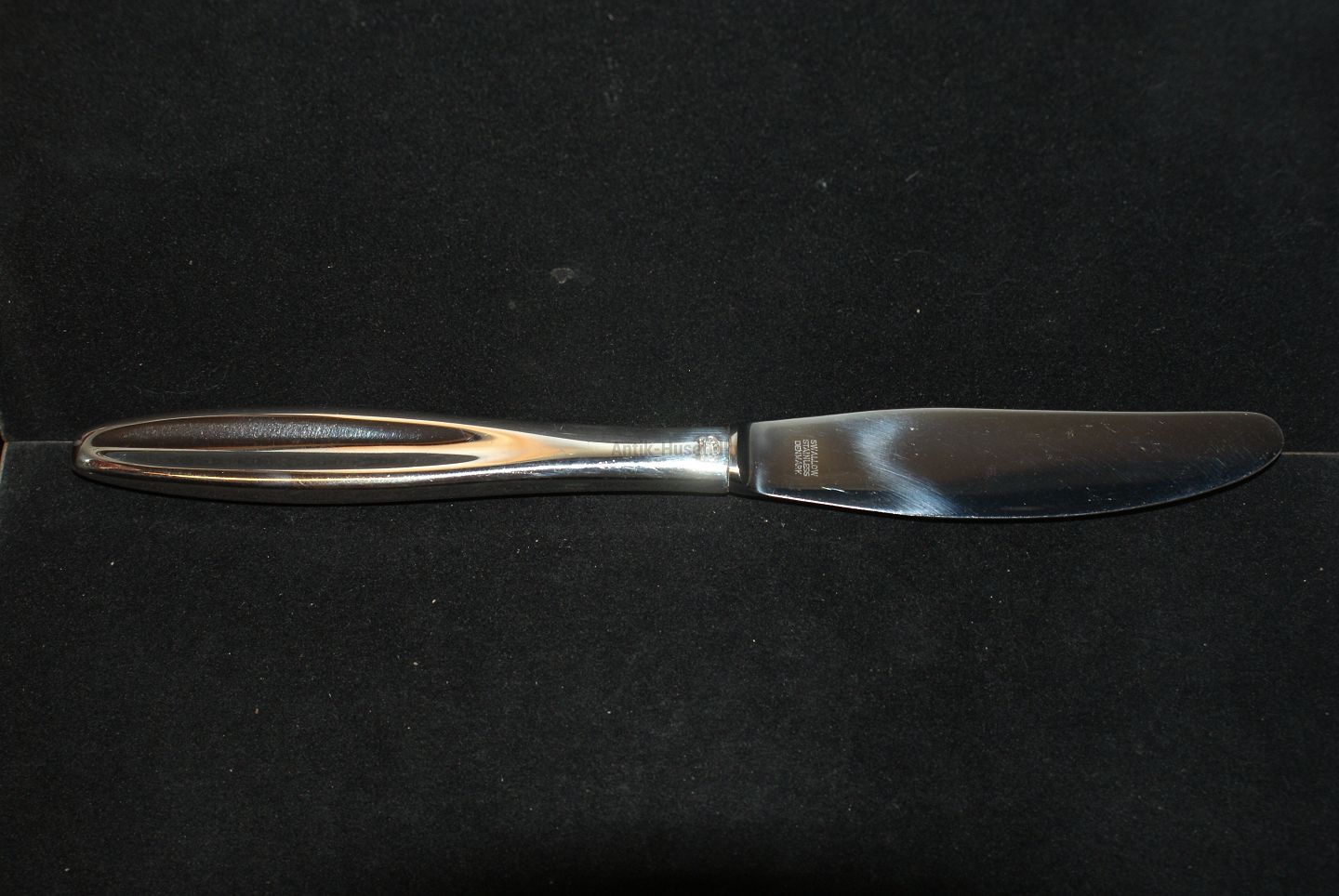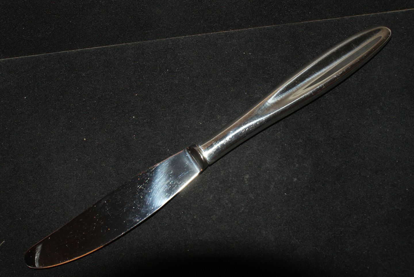 Middagskniv Jeanne Sterling sølv Formgivet i 1956 af Jeanne Grut og produceret hos Slagelse Sølvsmedie A.C. Illum Længde 22 cm. Flot og velholdt. Alt bestik er poleret og pakke i pose