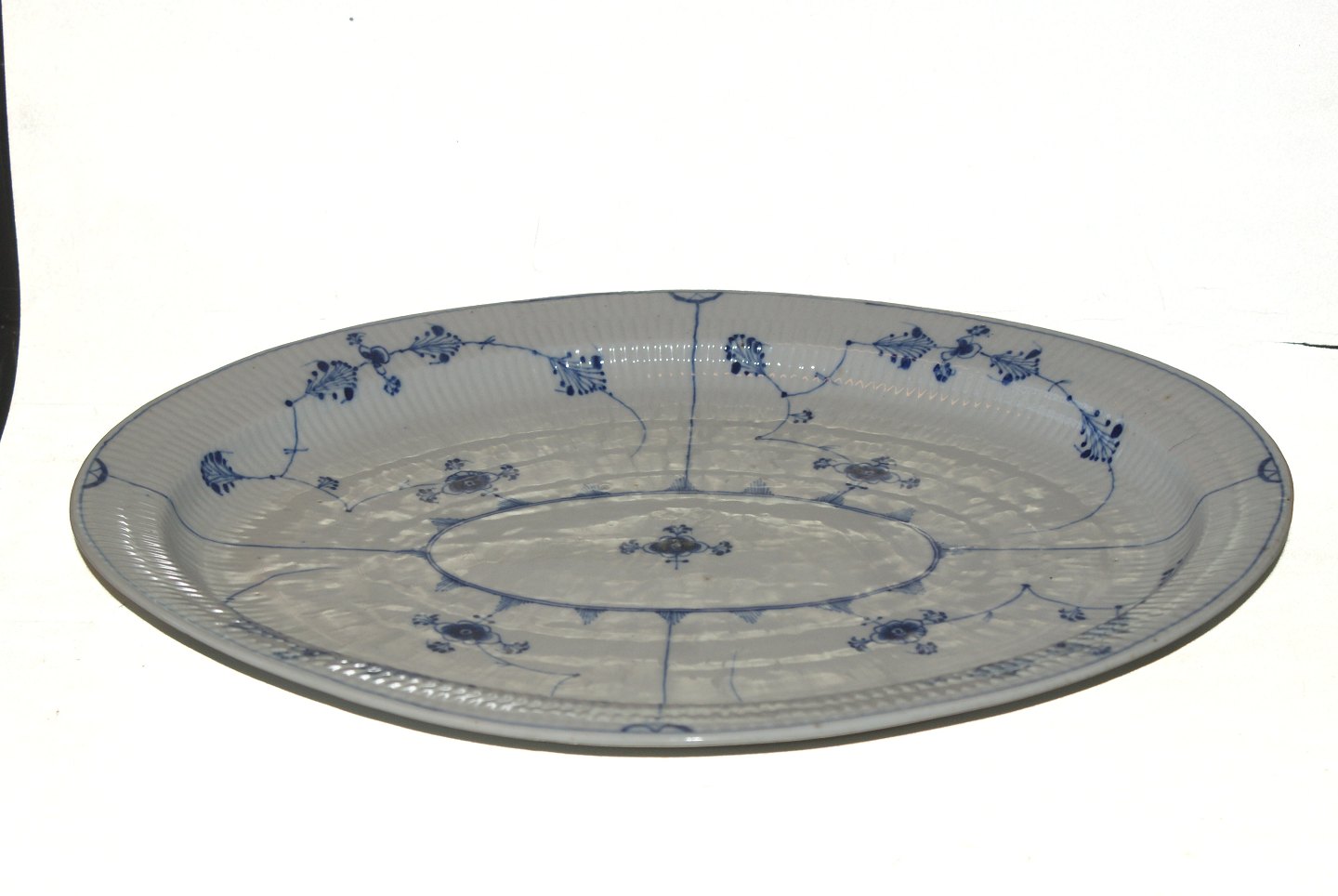 Kongelig Musselmalet Riflet, Mega stort bredovalt Fad, fra 1880-90 Har en lille brændningsfejl Dek. nr. 1/102 Længde 47 cm. Bredde 37 cm.