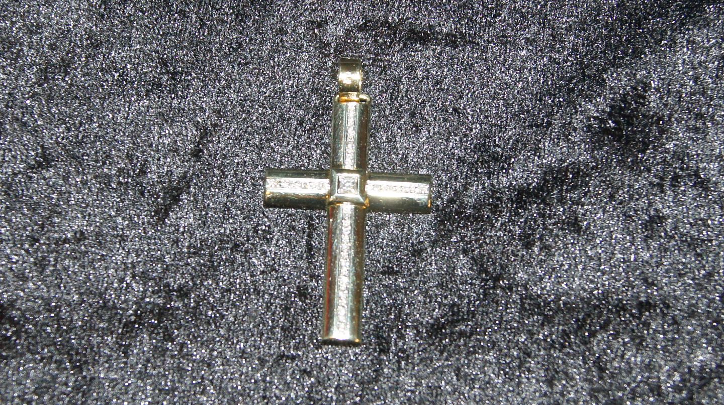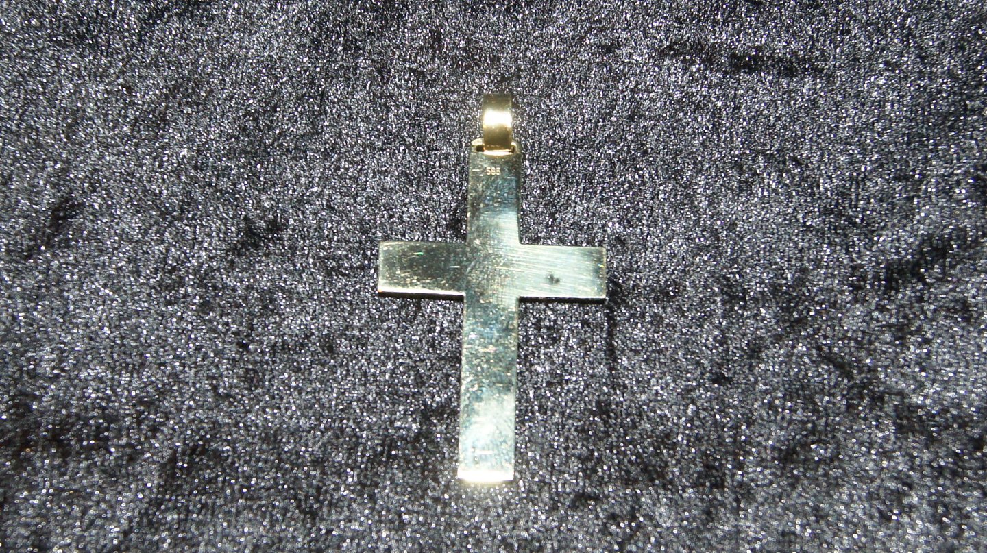 Kors i 14 karat Guld med brillianter Stemplet 585 Måler 47,37*26,90 mm Tjekket af guldsmed og varen findes ikke fysisk i vores butik, så kontakt os for yderligere info