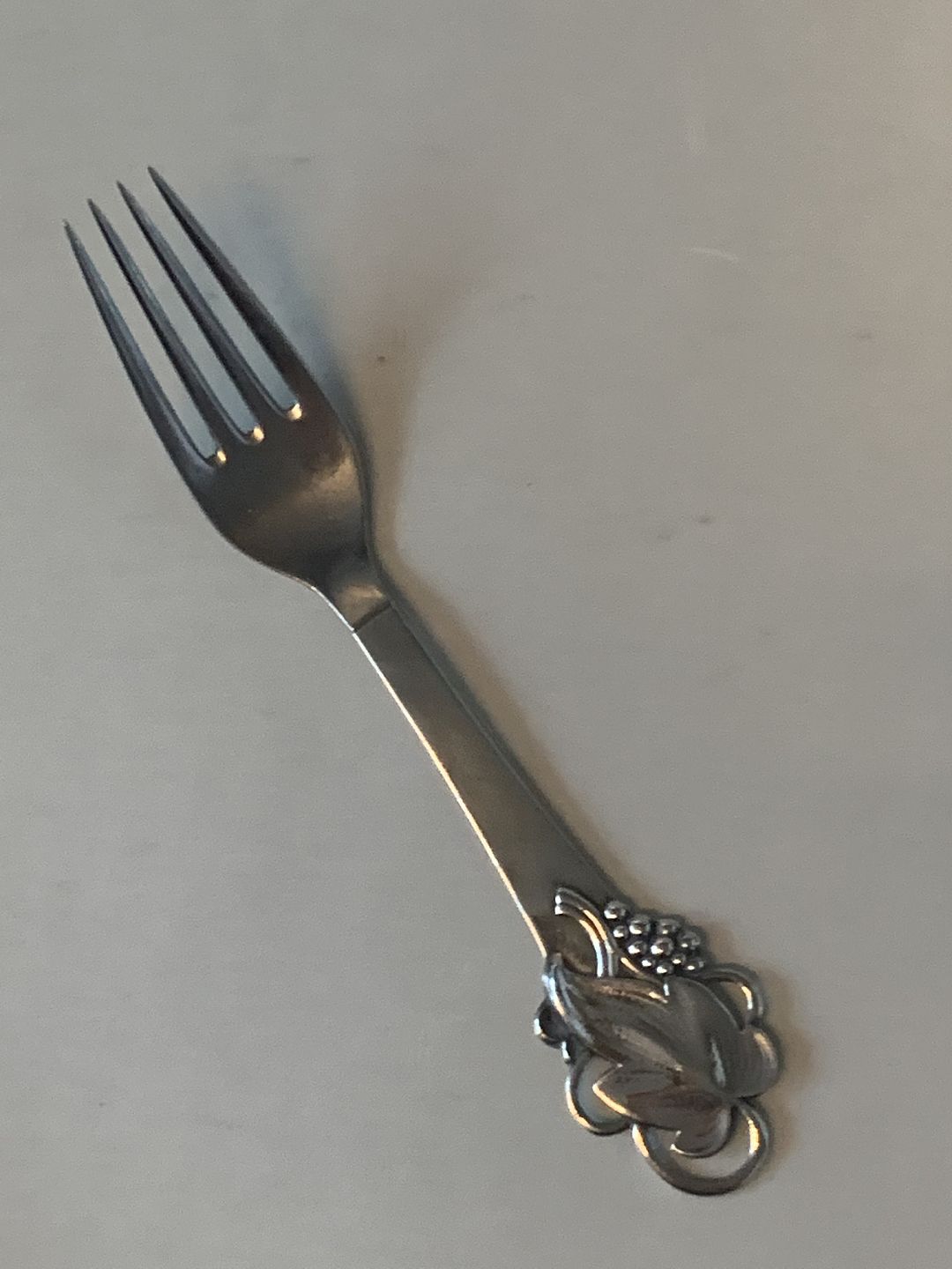 Grape vine Children's fork in Silver and steel Stamped Three Towers, CMC Stainless Length 15.7 cm. No engraving Used but well maintained.