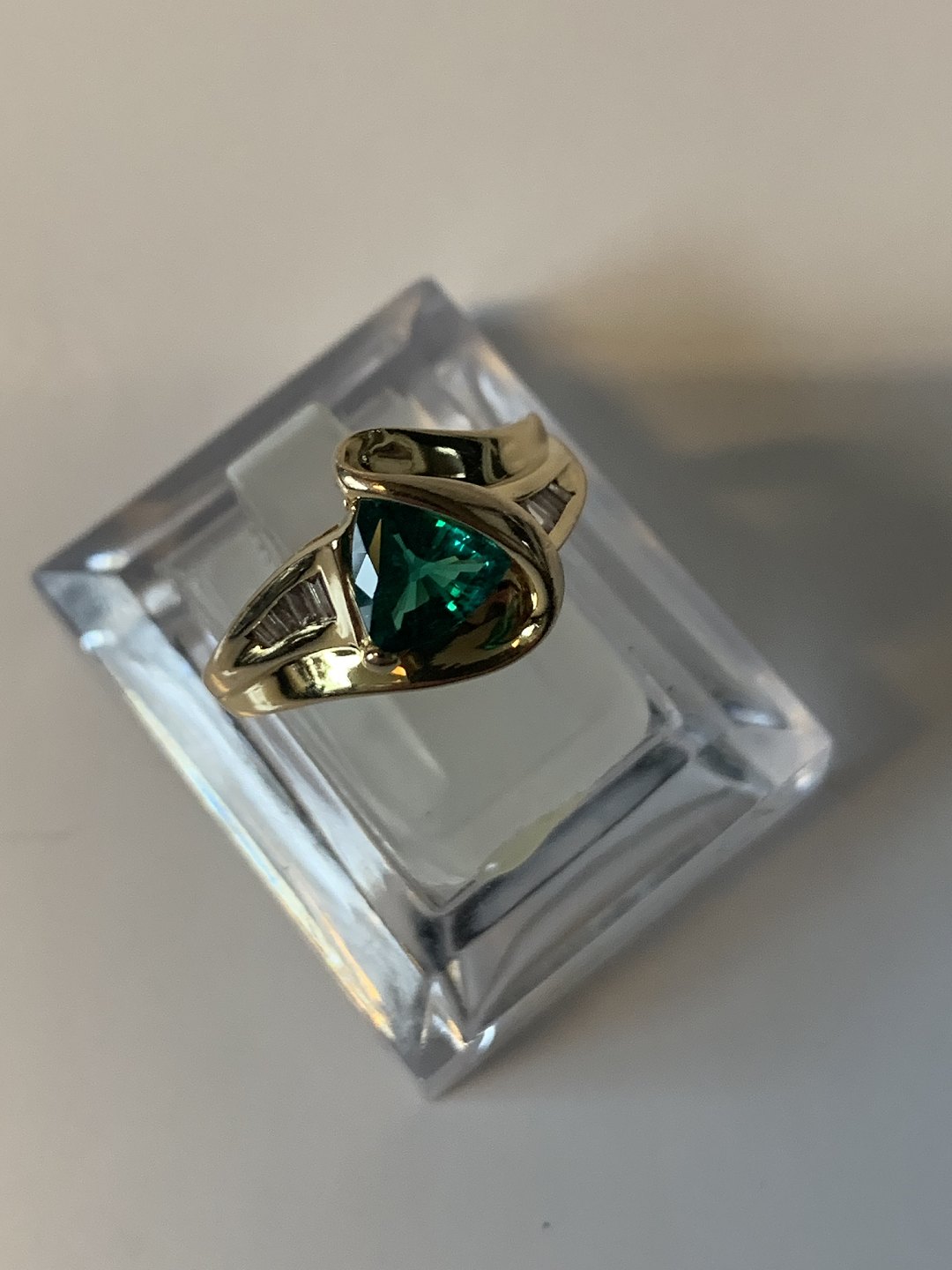 Damering med brillanter og grøn sten i 14 karat guld Stemplet HDS 585 Størrelse 56 Tjekket af guldsmed Flot og velholdt stand. Varen findes ikke fysisk i butikken. Kontakt os for fremvisning