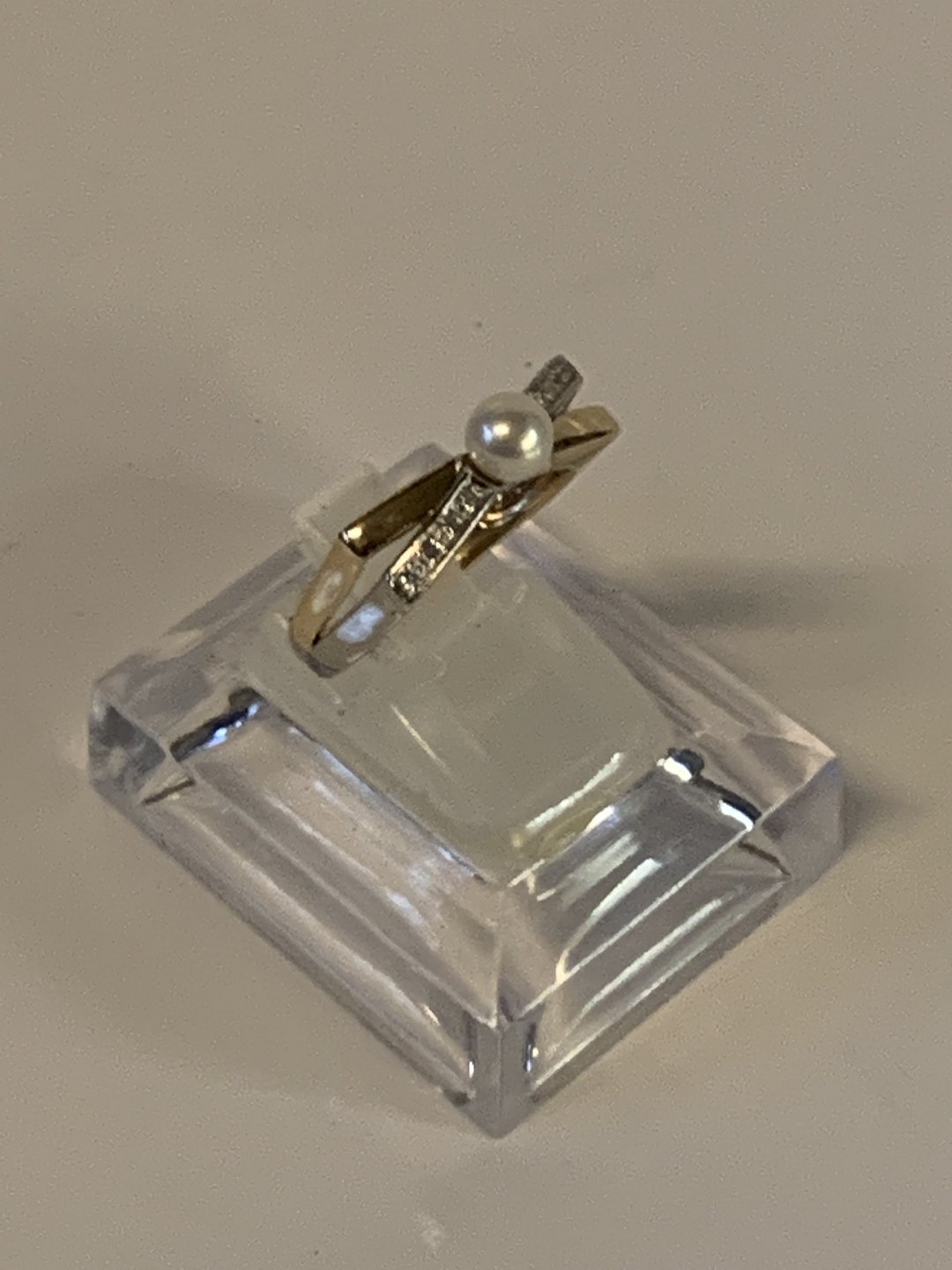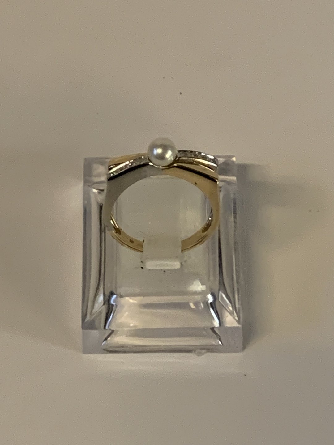 Ladies' ring with diamonds and a pearl in 14 carat red/white gold