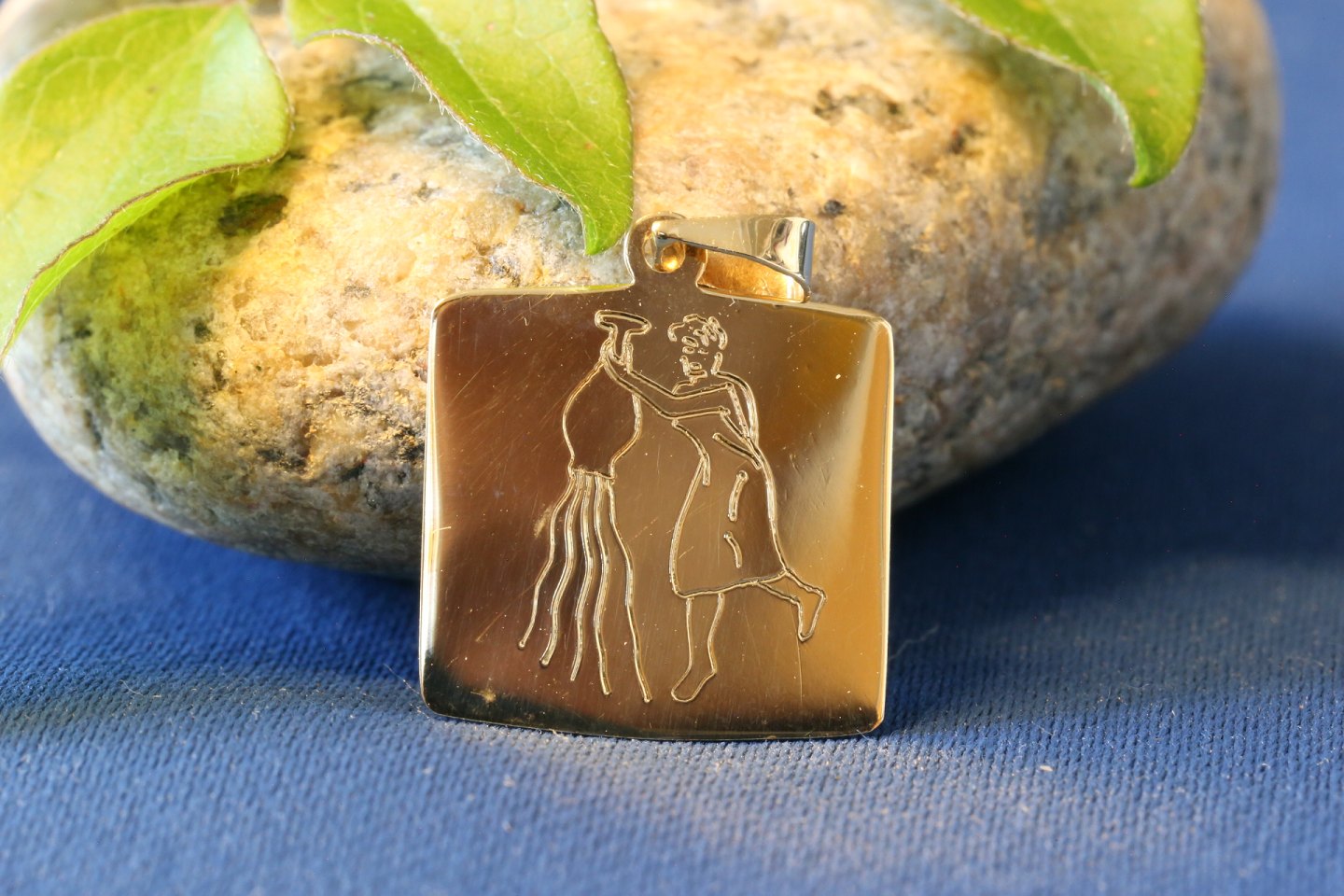 Beautiful small pendant in 14 carat gold, motif Aquarius. The pendant is small and thin, but a beautiful piece of jewelery for a necklace or as a combination with charms in a bracelet.