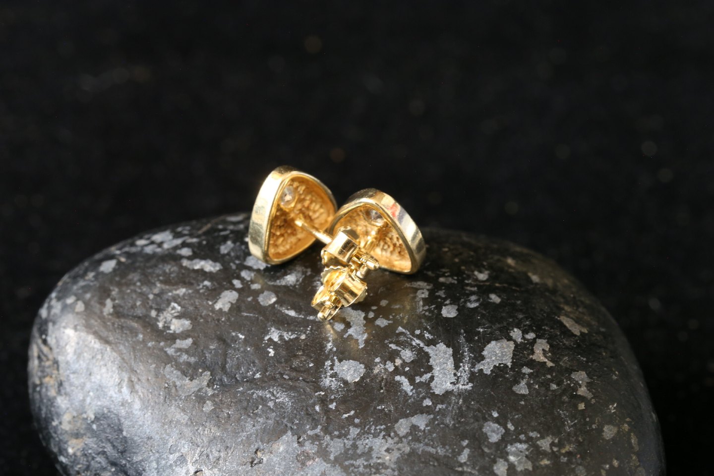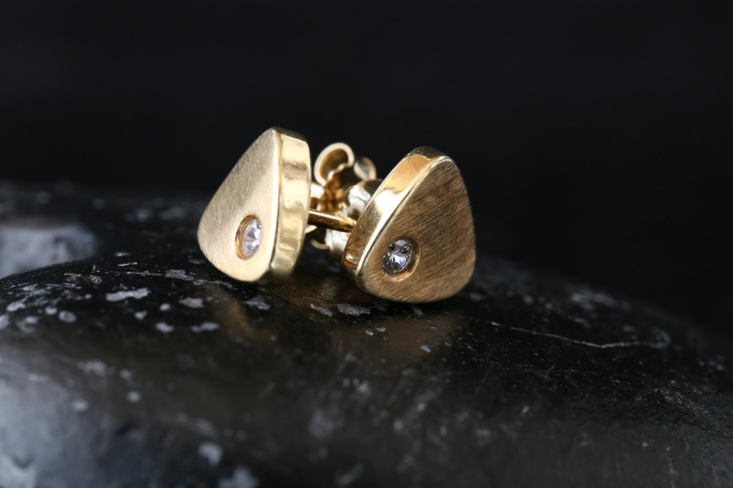 Beautiful studs in 14 carat gold, with inlaid clear stone. The ear studs are exclusive when they appear in gold. The elegant triangular shape with rounded edges is beautiful and elegant. Since these ear studs are not that big, they can be combined with other earrings or studs.