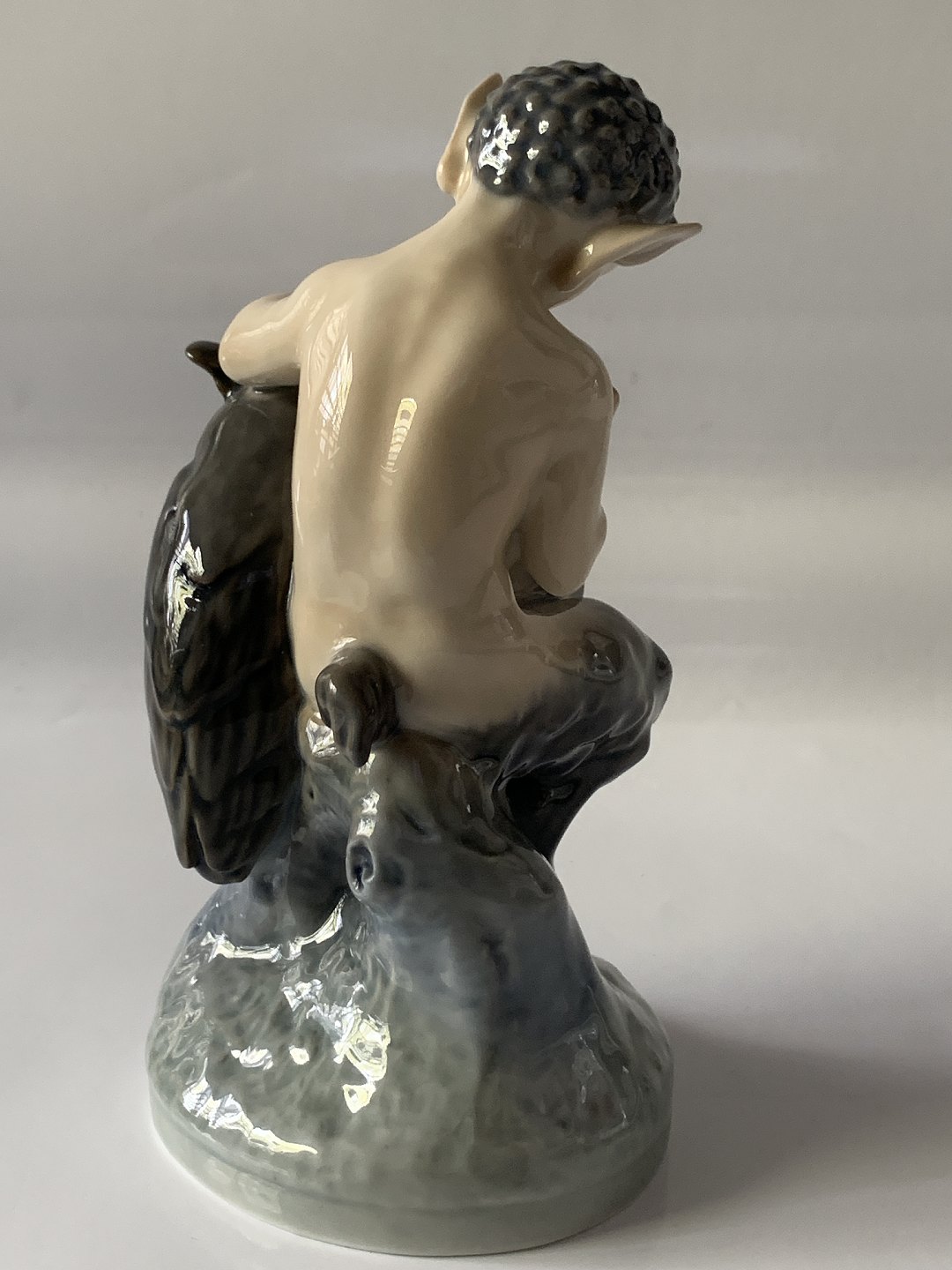 Beautiful little figure depicting Faun with owl. The figure is from Royal Copenhagen, 1st assortment and is made with beautiful colors and details. Figures from Royal Copenhagen are beautiful decorative objects that can be part of collections, or decorate a bookcase or windowsill. With a height of 16 centimeters, it is a nice little figure that will look great in any home.
