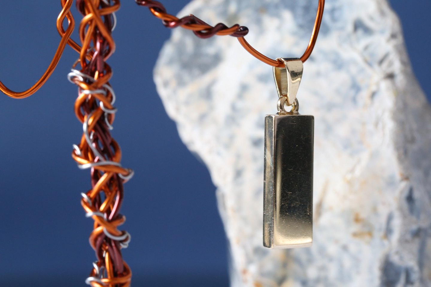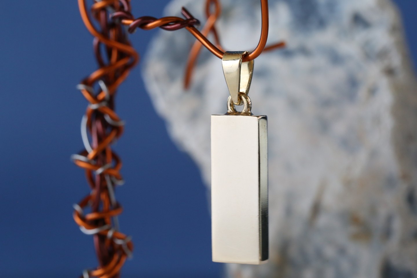 Flot og elegant vedhæng i 14 karat guld, udformet som guldbarre. Vedhænget er minimalistisk med lige linjer, og diskret look. Dette vedhæng er lavet i massivt guld, og kunne også være en investering i guld. Sæt vedhænget i en flot guldkæde, og lav din egen eksklusive halskæde.