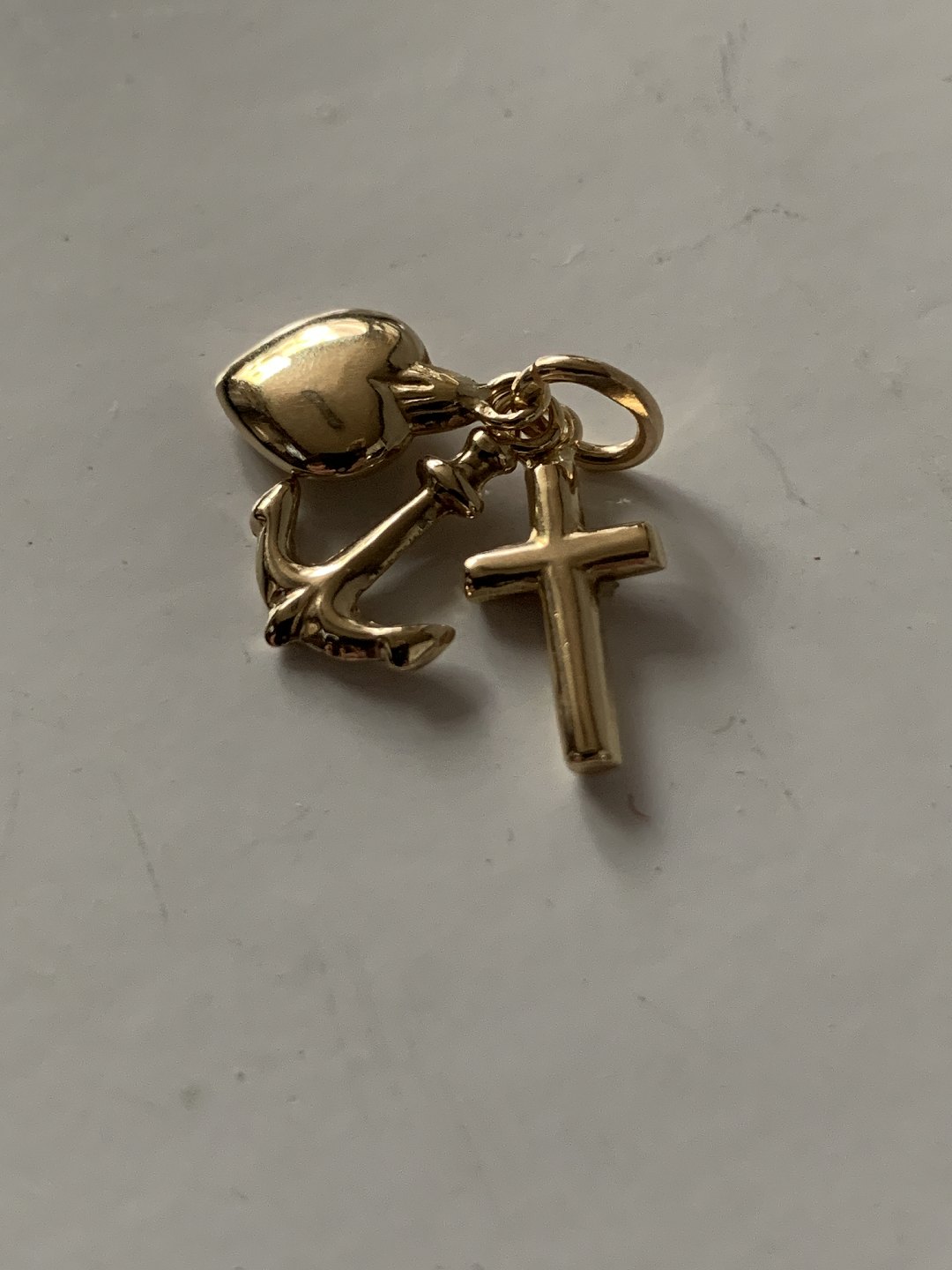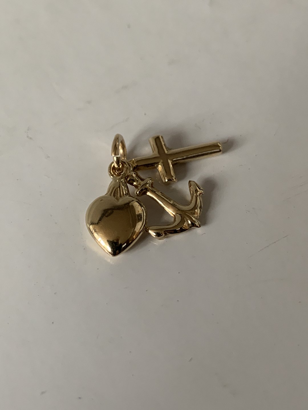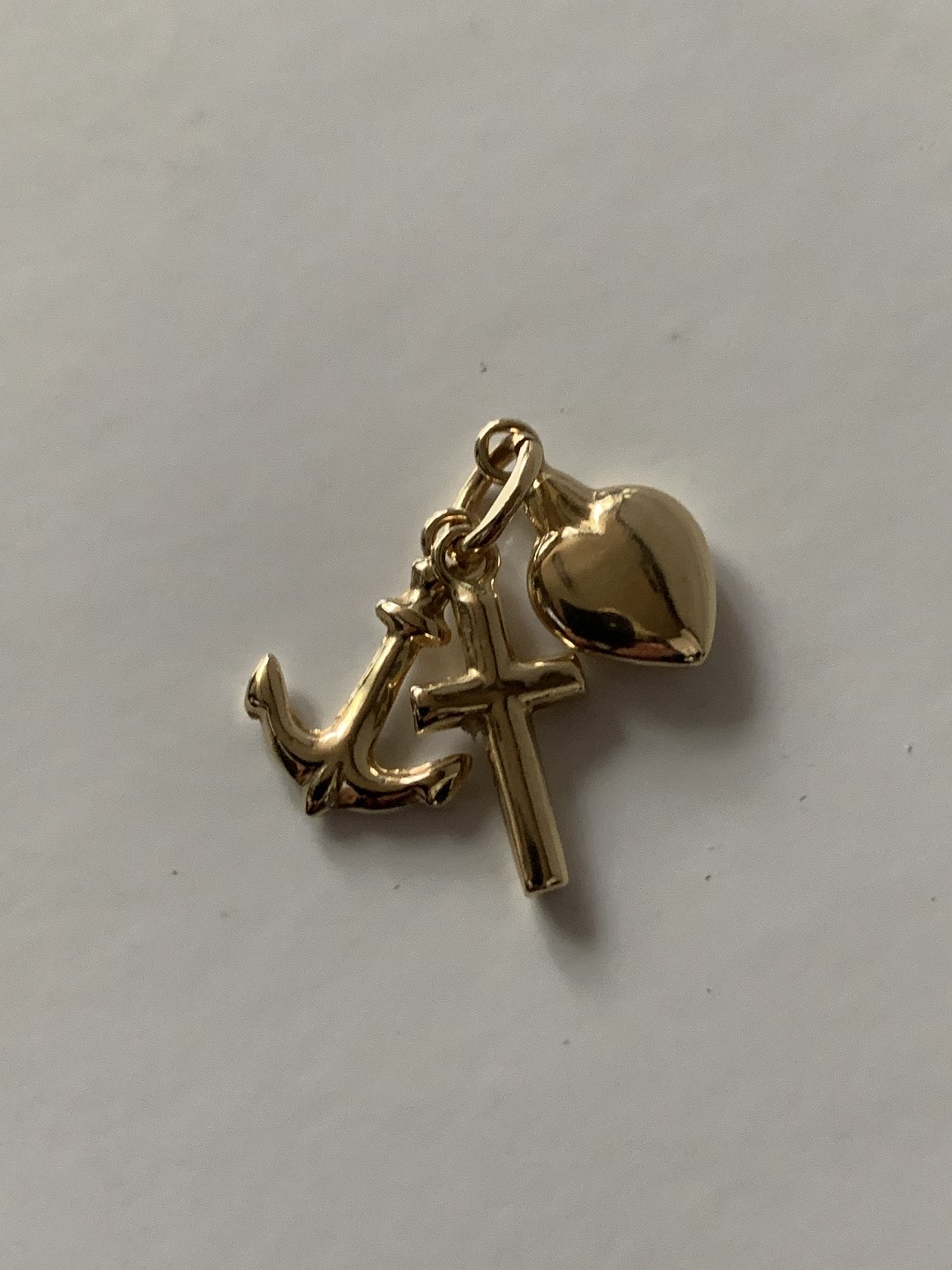 Vedhæng til halskæde eller armbånd i 14 karat guld, stemplet 585. Tro, håb og kærlighed.