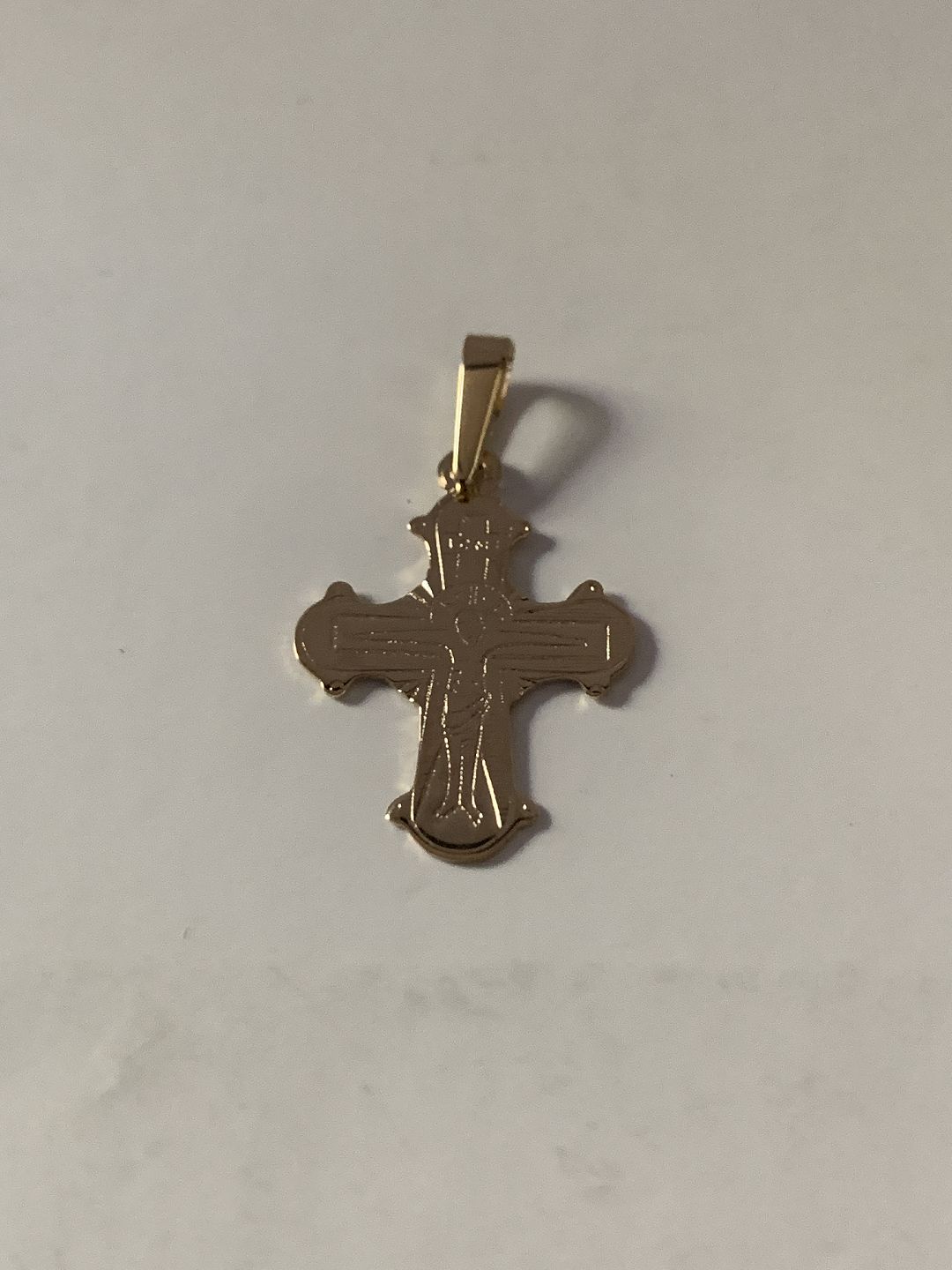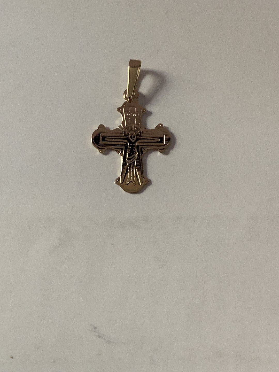 Beautiful little gold crucifix for necklace or bracelet. The pendant is decorated on the front, but shiny on the back. The decoration on the front is detailed and above the suffering Christ is ICNI. This is a beautiful little pendant that can be used as a christening or confirmation gift.