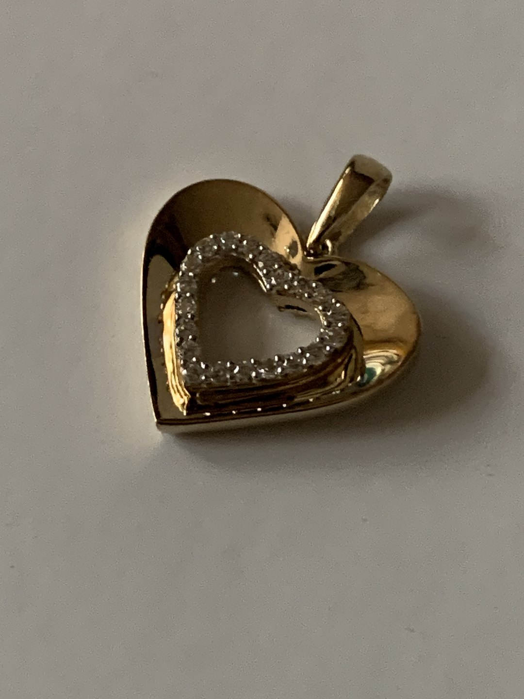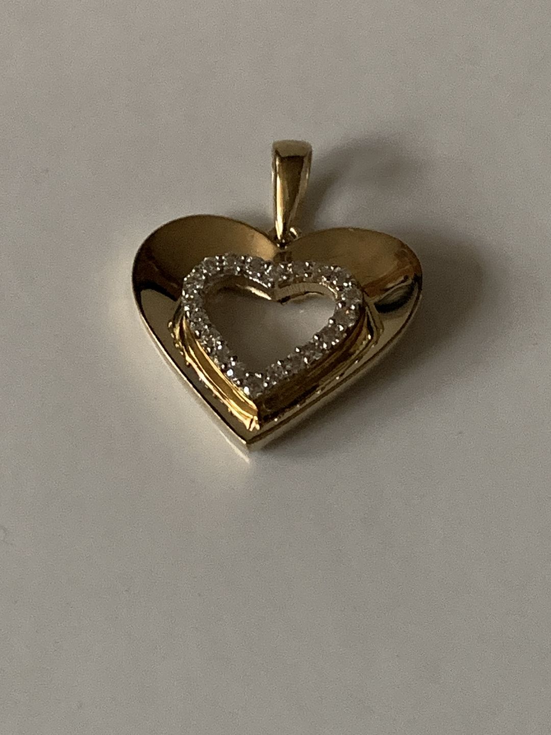 Beautiful pendant, shaped like a heart with inlaid zircons, in 9 carat gold. Suitable for a necklace or as a pendant in a bracelet.