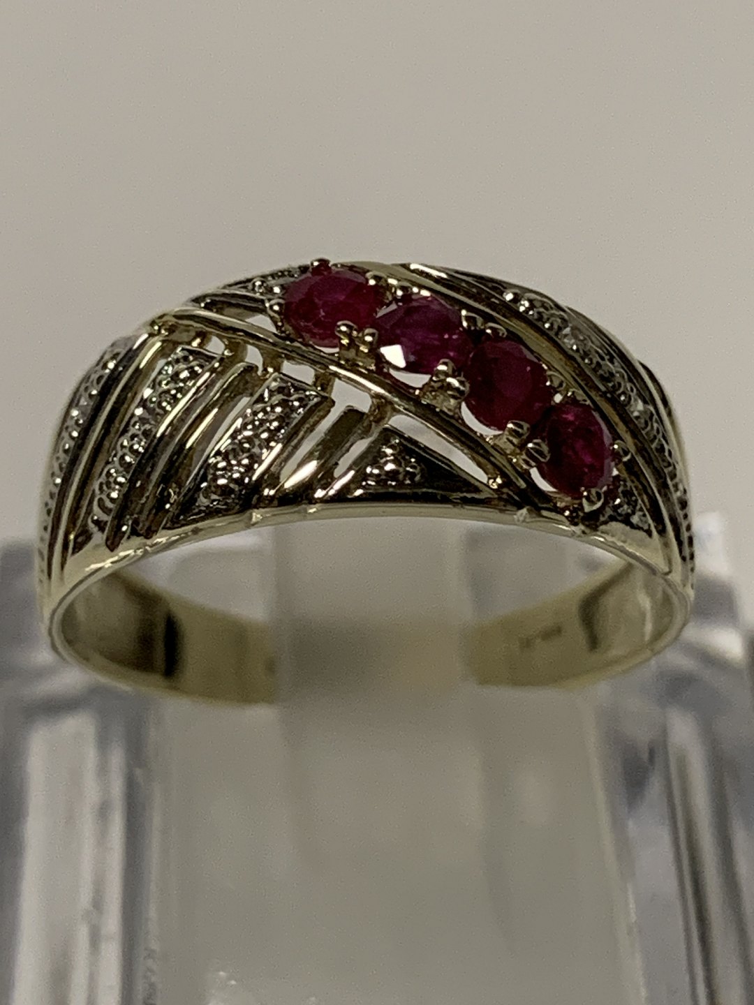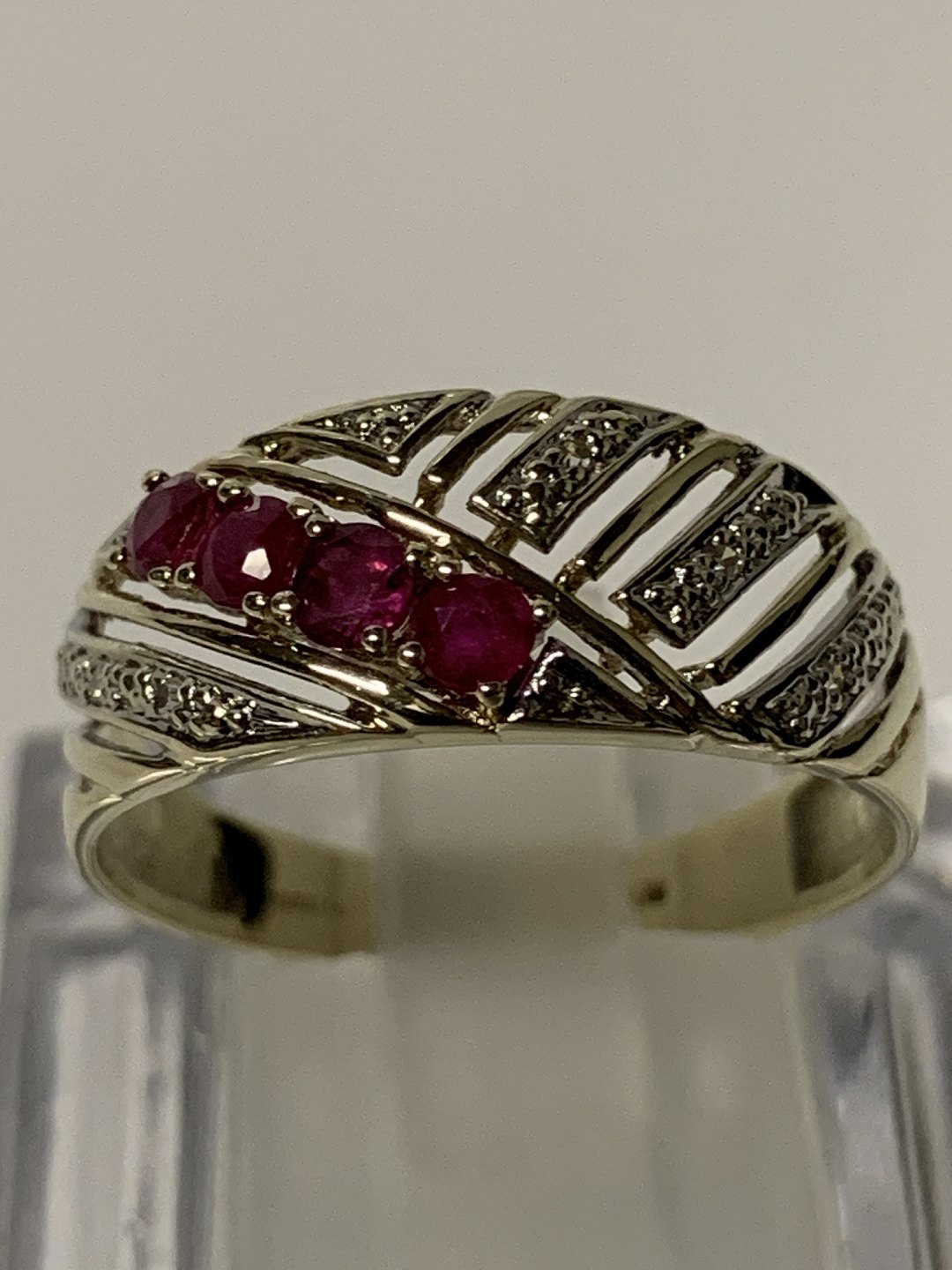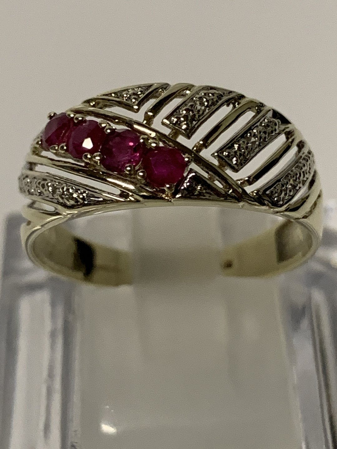 Flot Damering, med røde rubiner samt indlagte diamanter, i 8 karat guld.