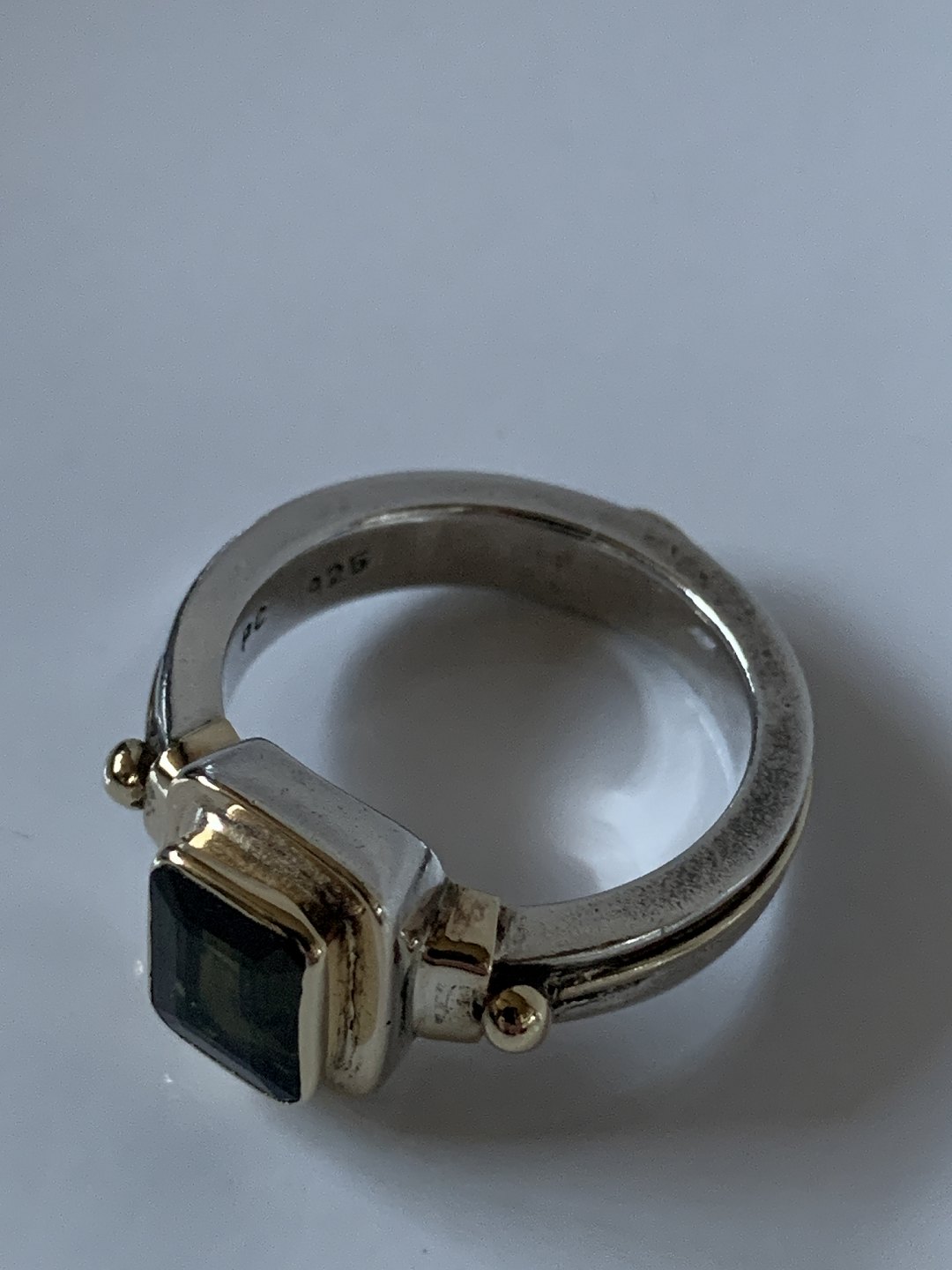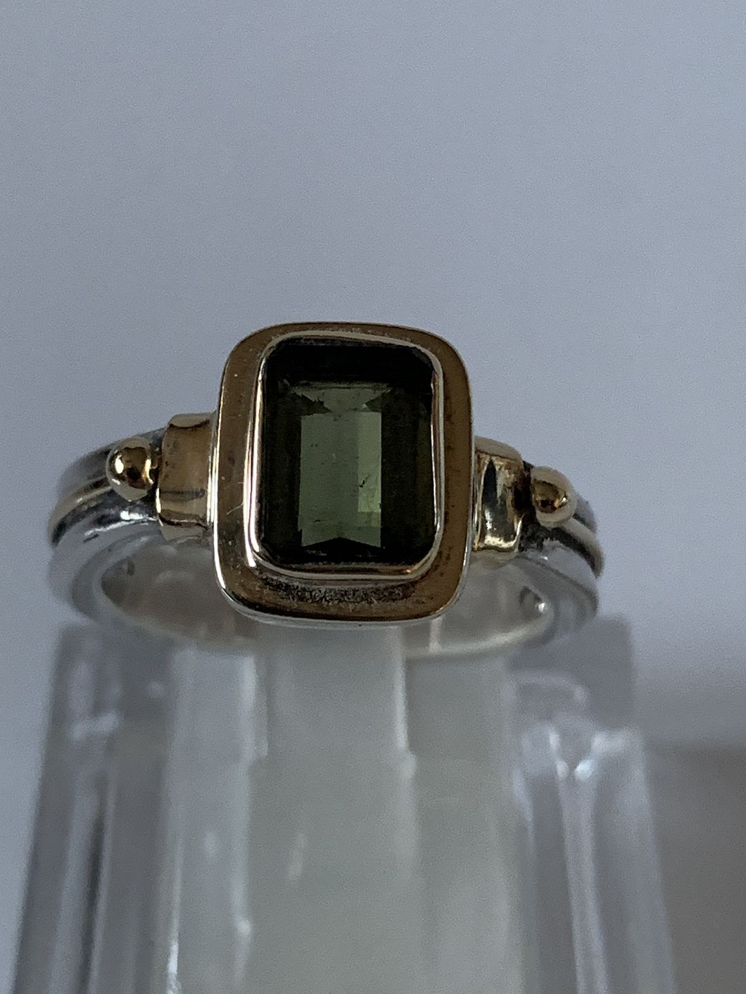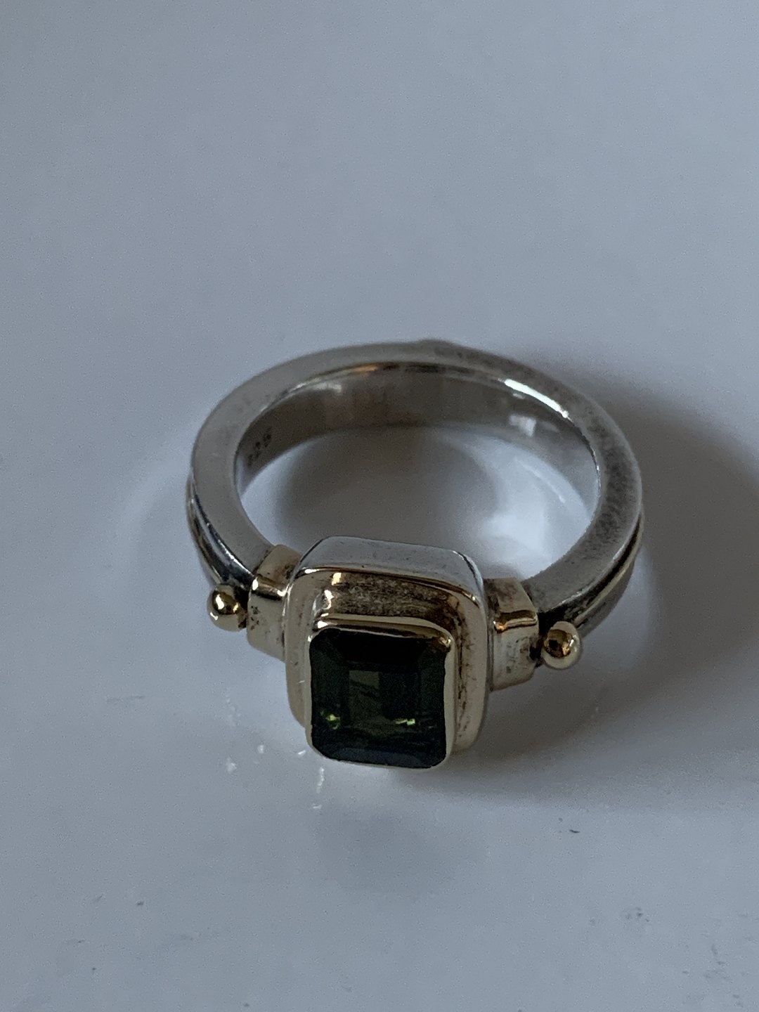 Ladies' ring in silver with a green stone inlaid with gold, size 57