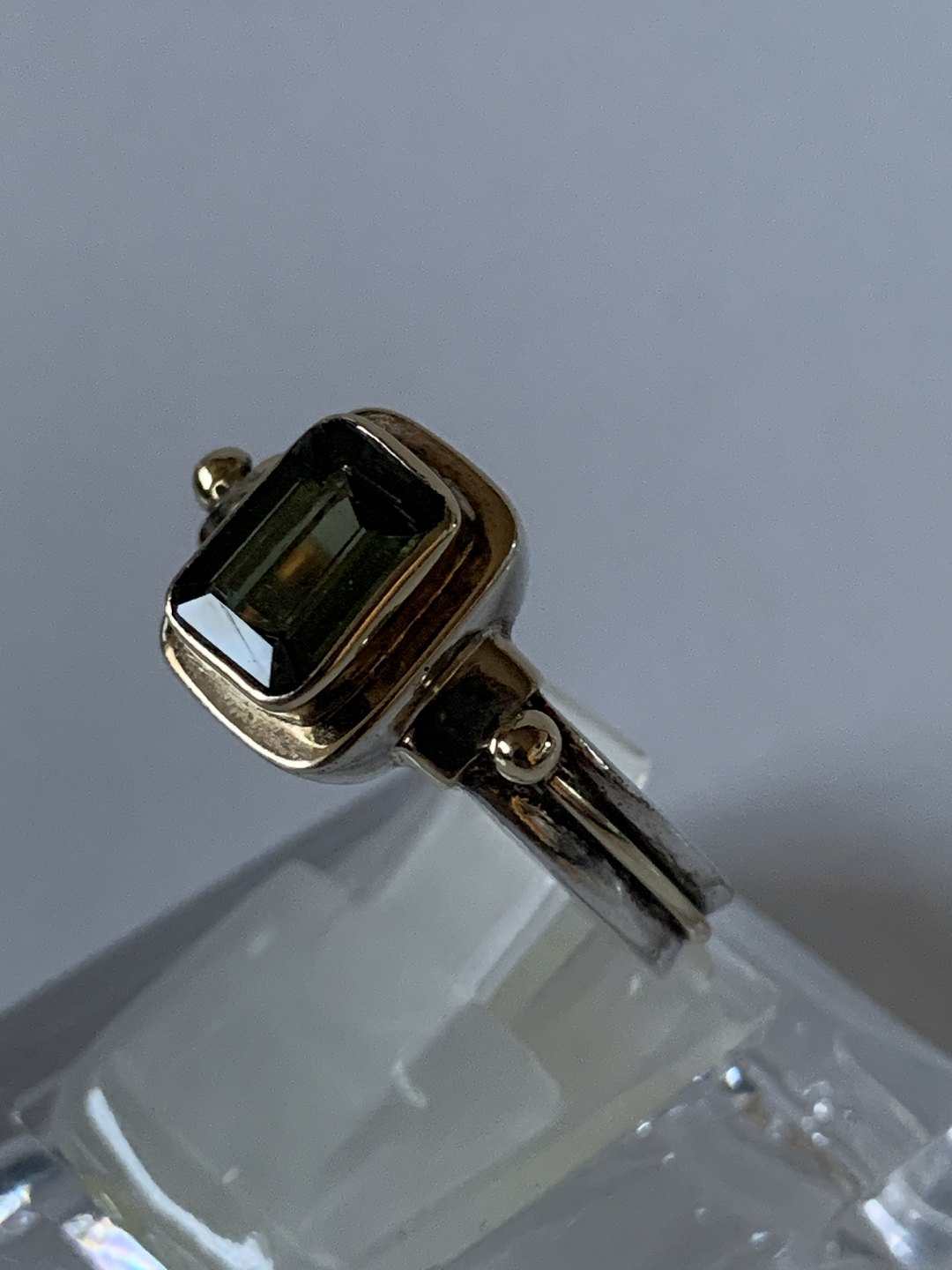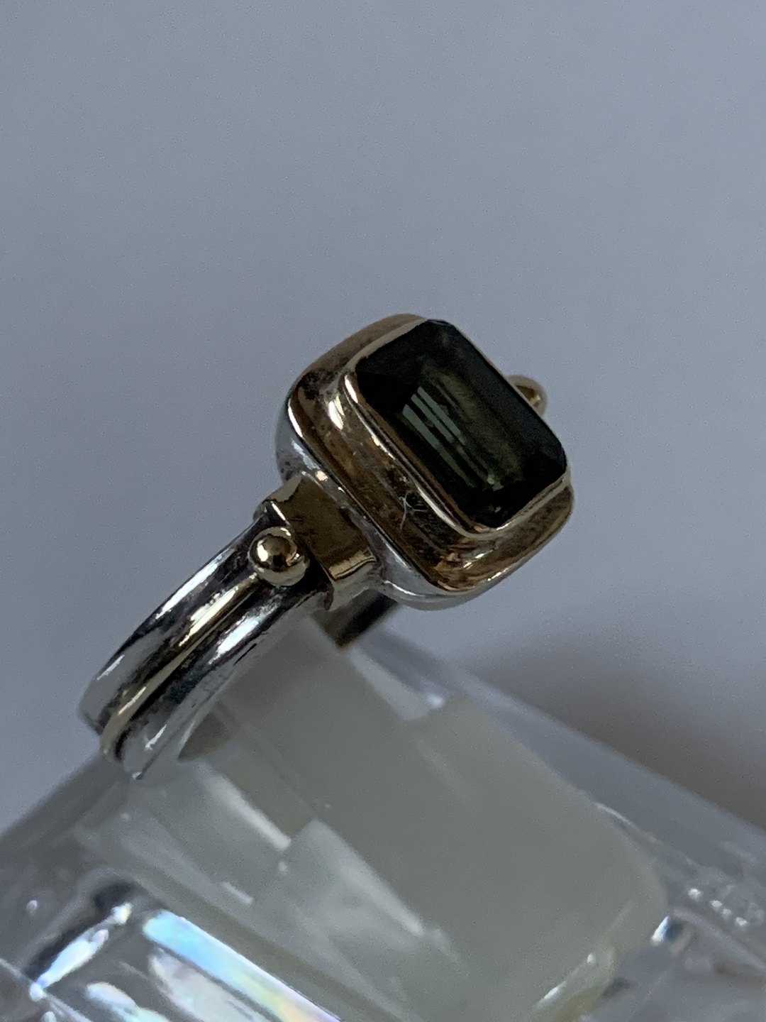 Ladies' ring in silver with a green stone inlaid with gold