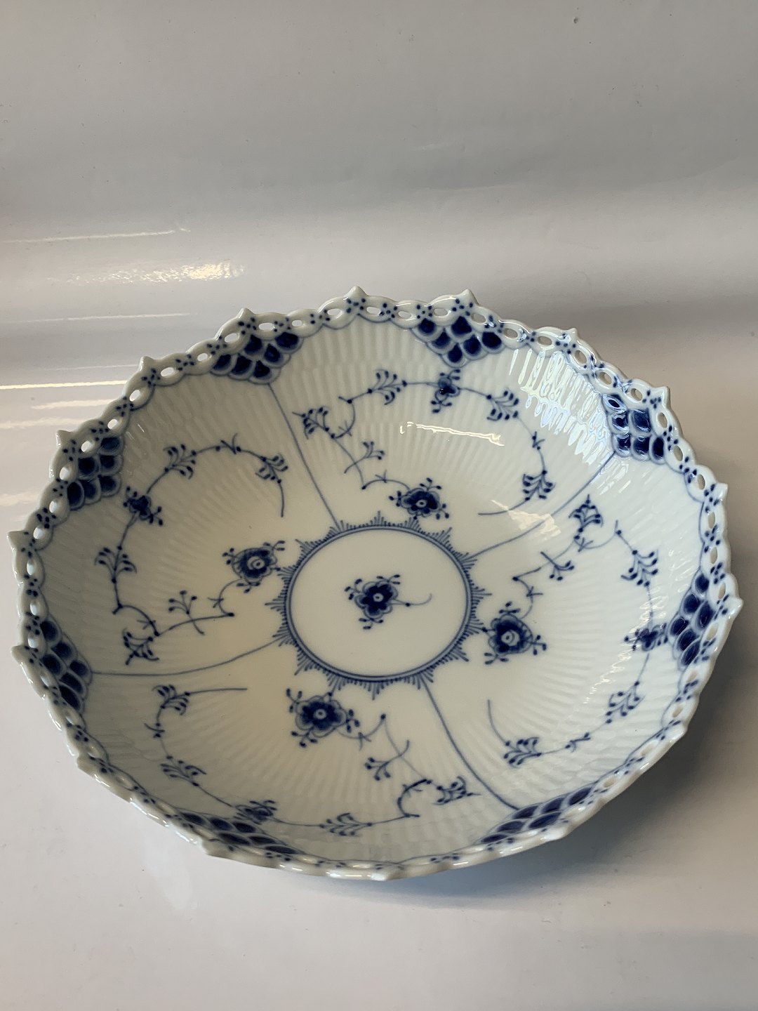 Royal Copenhagen Fruit Bowl Full lace blue fluting 2st grade Decoration Number 428 Diameter 21 cm. Nice and well-maintained condition