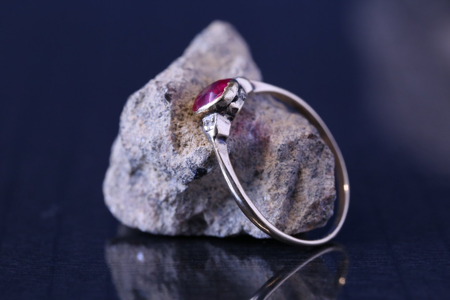 Smuk og elegant guldring med flot stor rubin, og to mindre diamanter. Den røde rubin giver ringen liv og styrke, men de to mindre diamanter reflekterer lyset, og giver ringen liv.