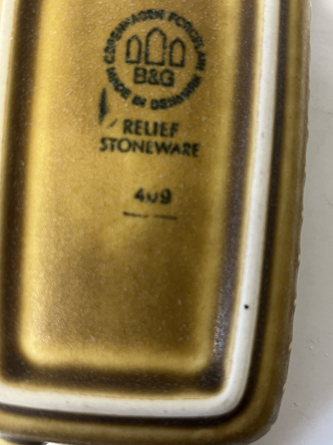Bing & Grøndahl/Nissen/Kronjyden, Relief stentøj, Smør skål Designet af Jens Harald Quistgaard. Højde 3,5 cm Længde 19 cm Brede 8 cm Flot og velholdt stand