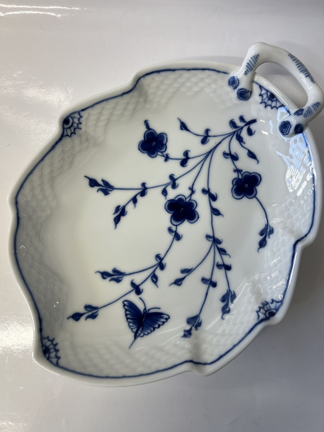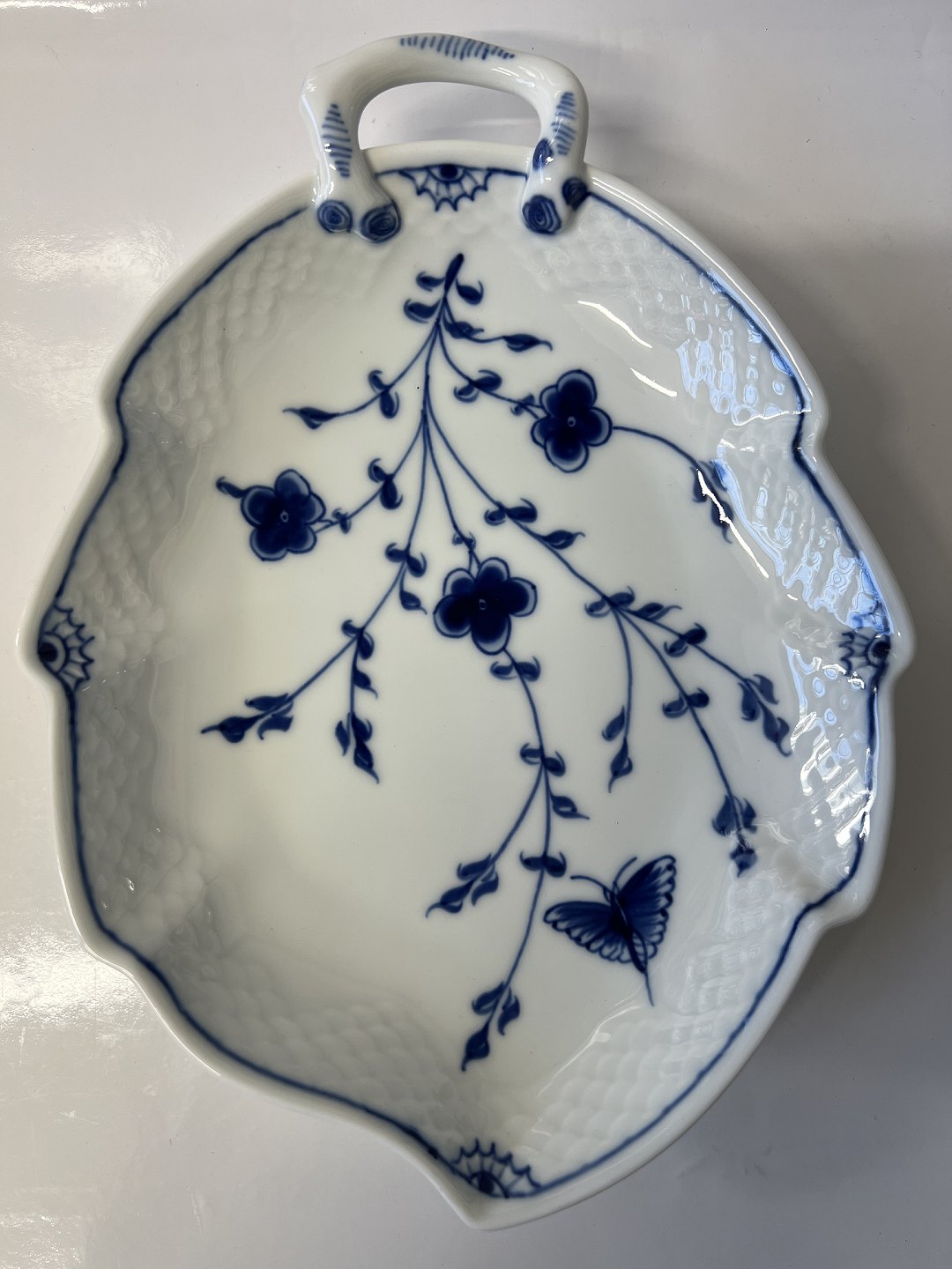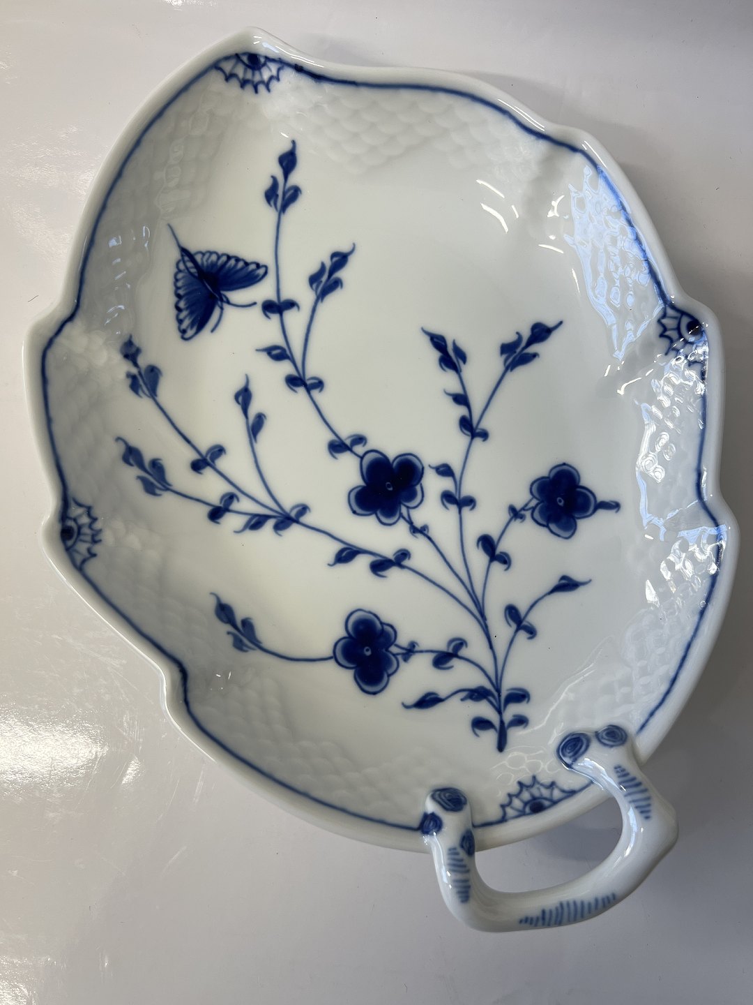 Bing & Grøndahl Sommerfugl, Bladformet Kagefad Dekorationsnummer 357 3.sortering Længde 25 cm. Bredde 18,5 cm. Pæn og velholdt stand