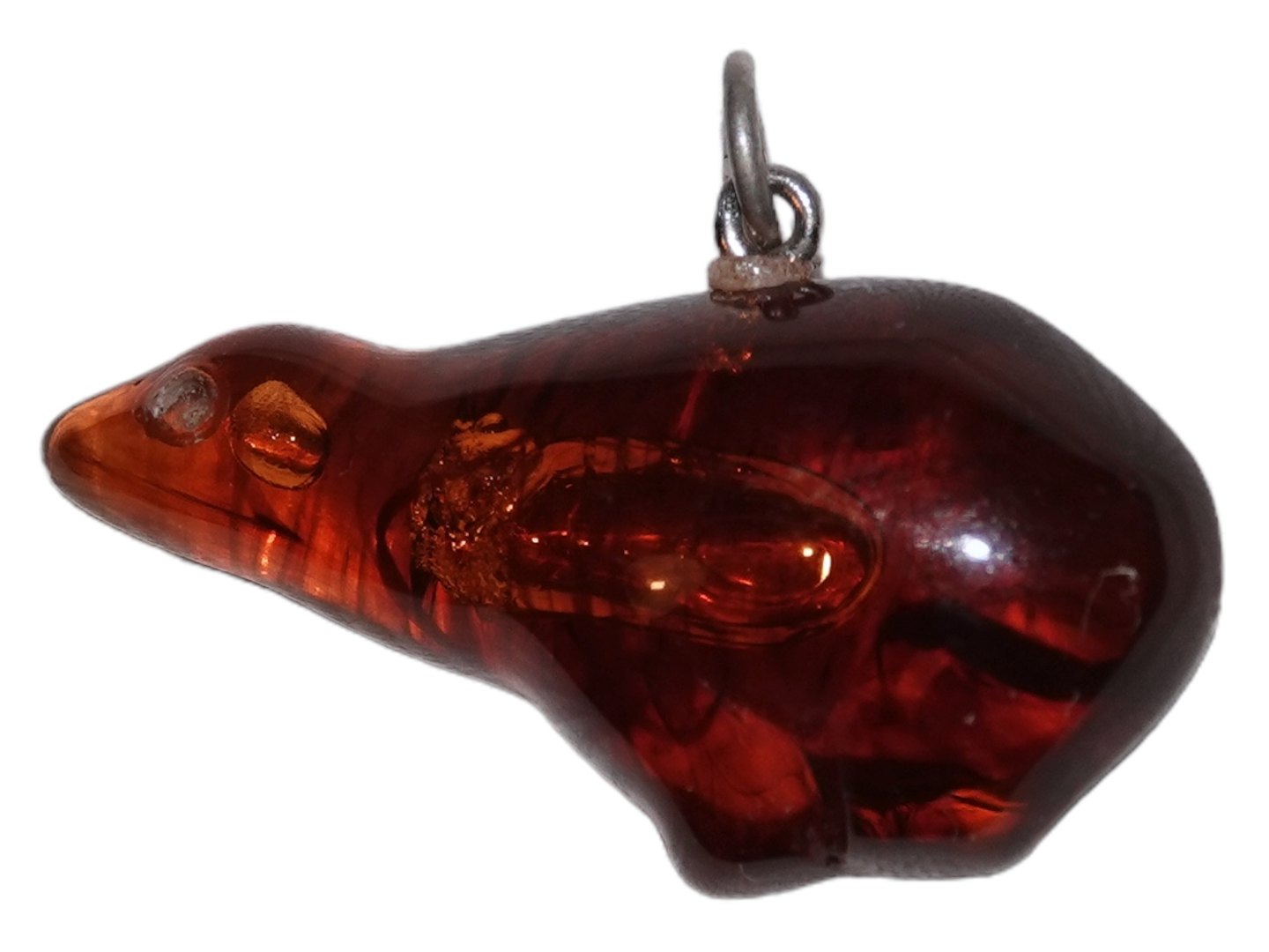 Amber pendant shaped like a polar bear with silver mounting. The amber piece measures 3.5 by 1.7 cm. Excellent condition.