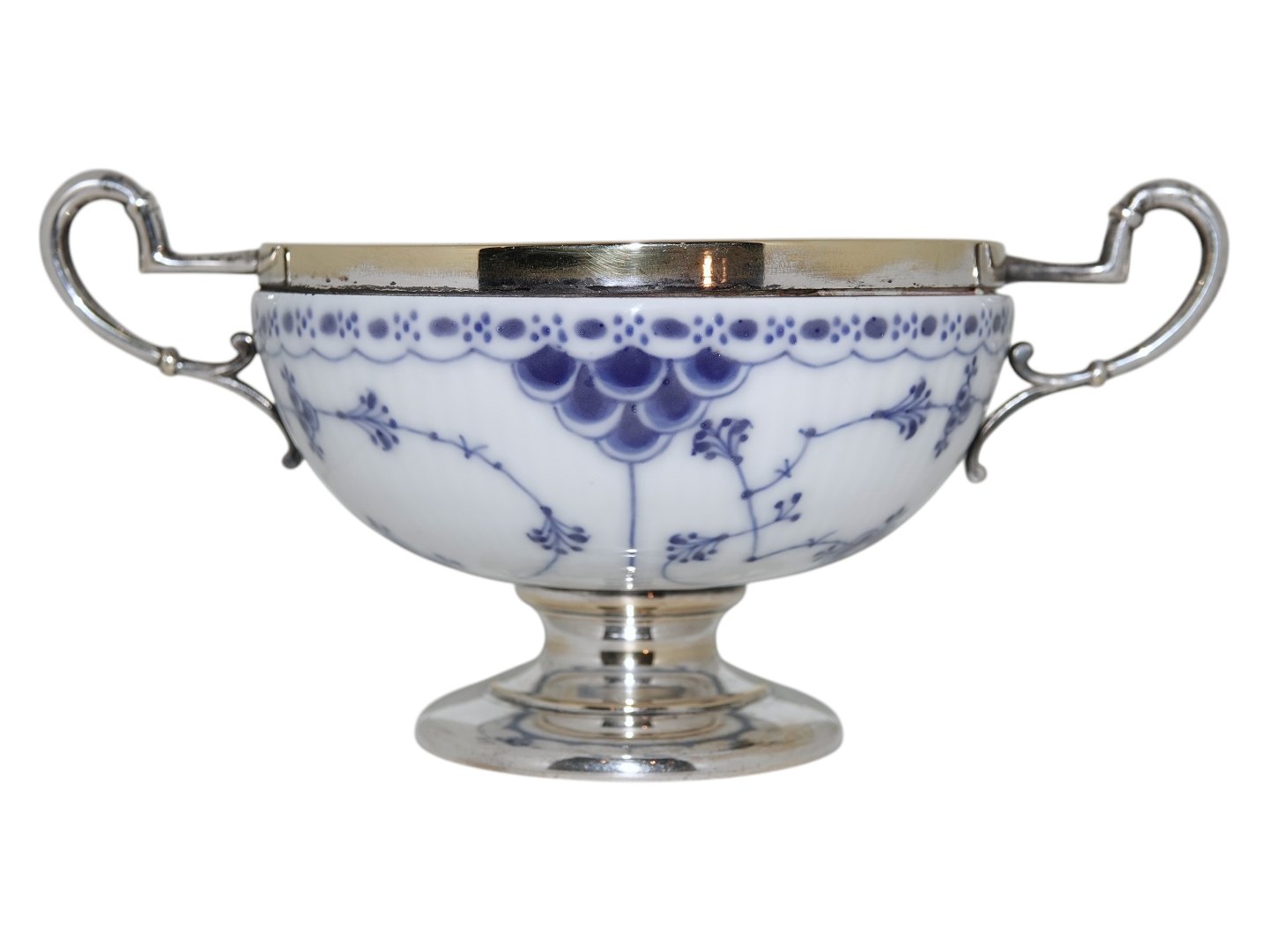 Royal Copenhagen Blue Fluted Half Lace, sugar bowl with silver plate stand and handles.