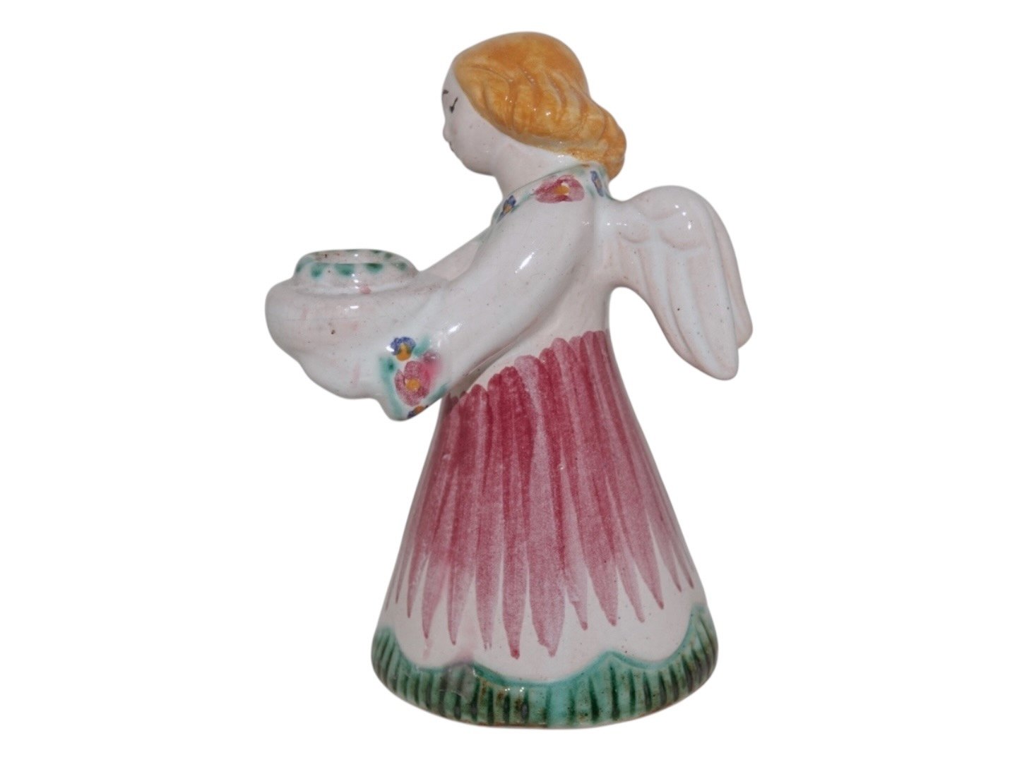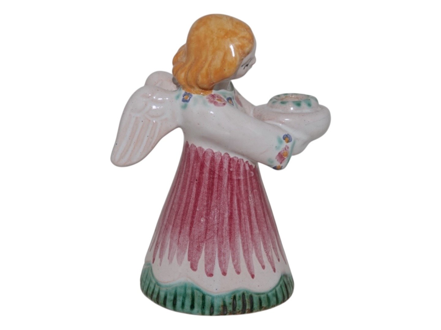 Hjorth art pottery, angel figurine / candle light holder. Red, green and yellow color. Decoration number 420. Height 11.5 cm. Perfect condition.