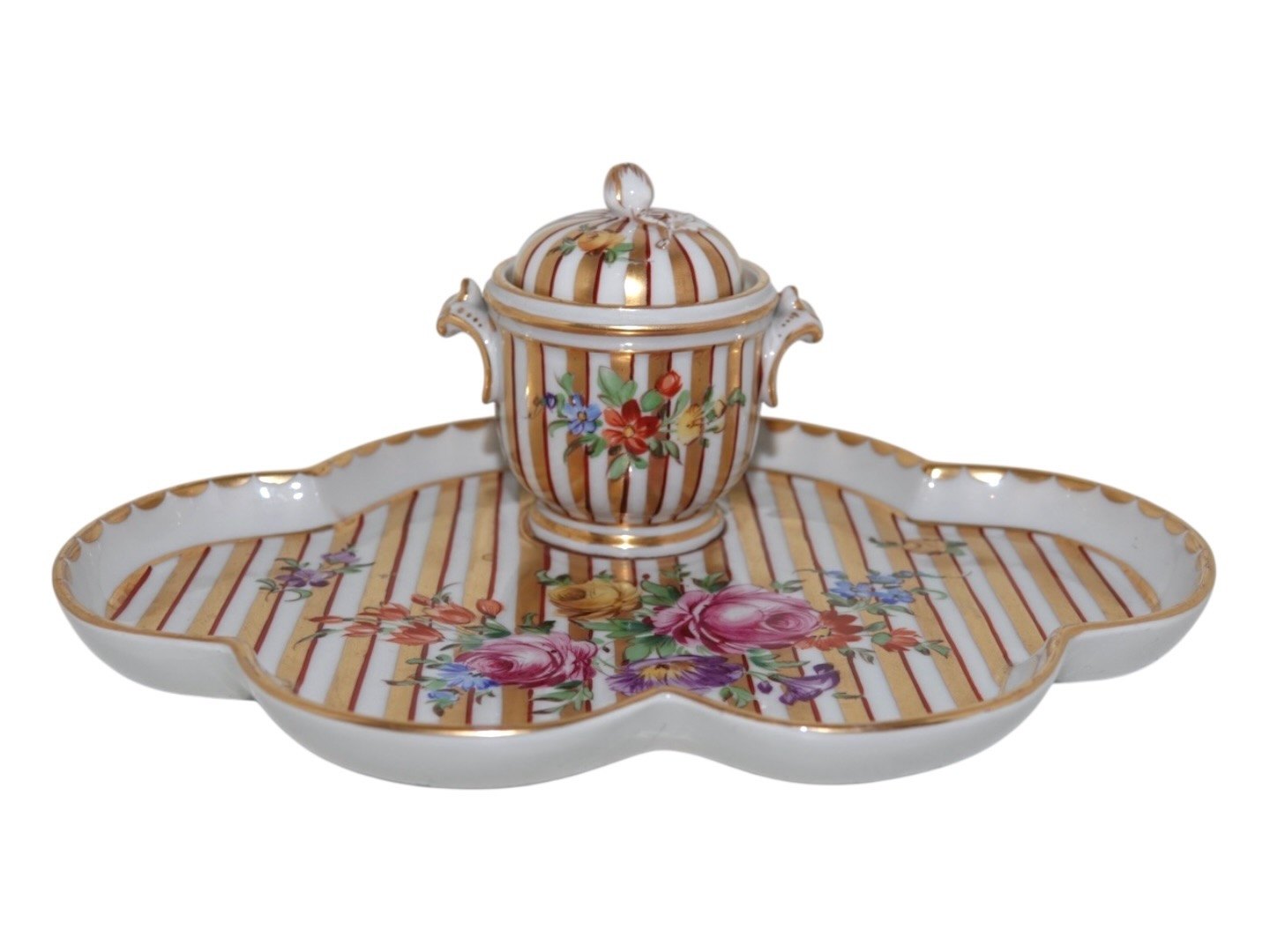 Porcelain most likely from Germany, inkwell with Saxon Flower decoration. Measures 20.7 by 17.0 cm. Perfect condition.