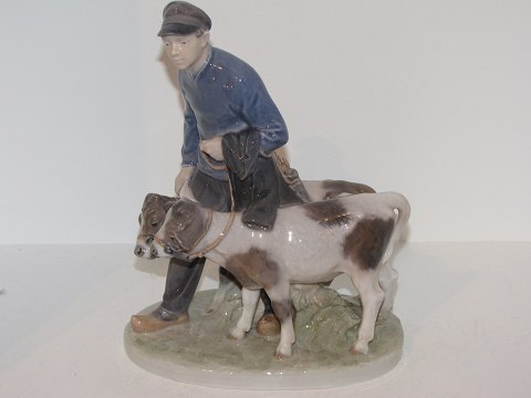 Stor Royal Copenhagen figur, dreng med to kalve. Stemplerne viser, at denne er produceret i mellem 1969 og 1974. Dekorationsnummer 1858. 2. sortering. Højde 23 cm., længde 18 cm. Perfekt stand uden fejl.