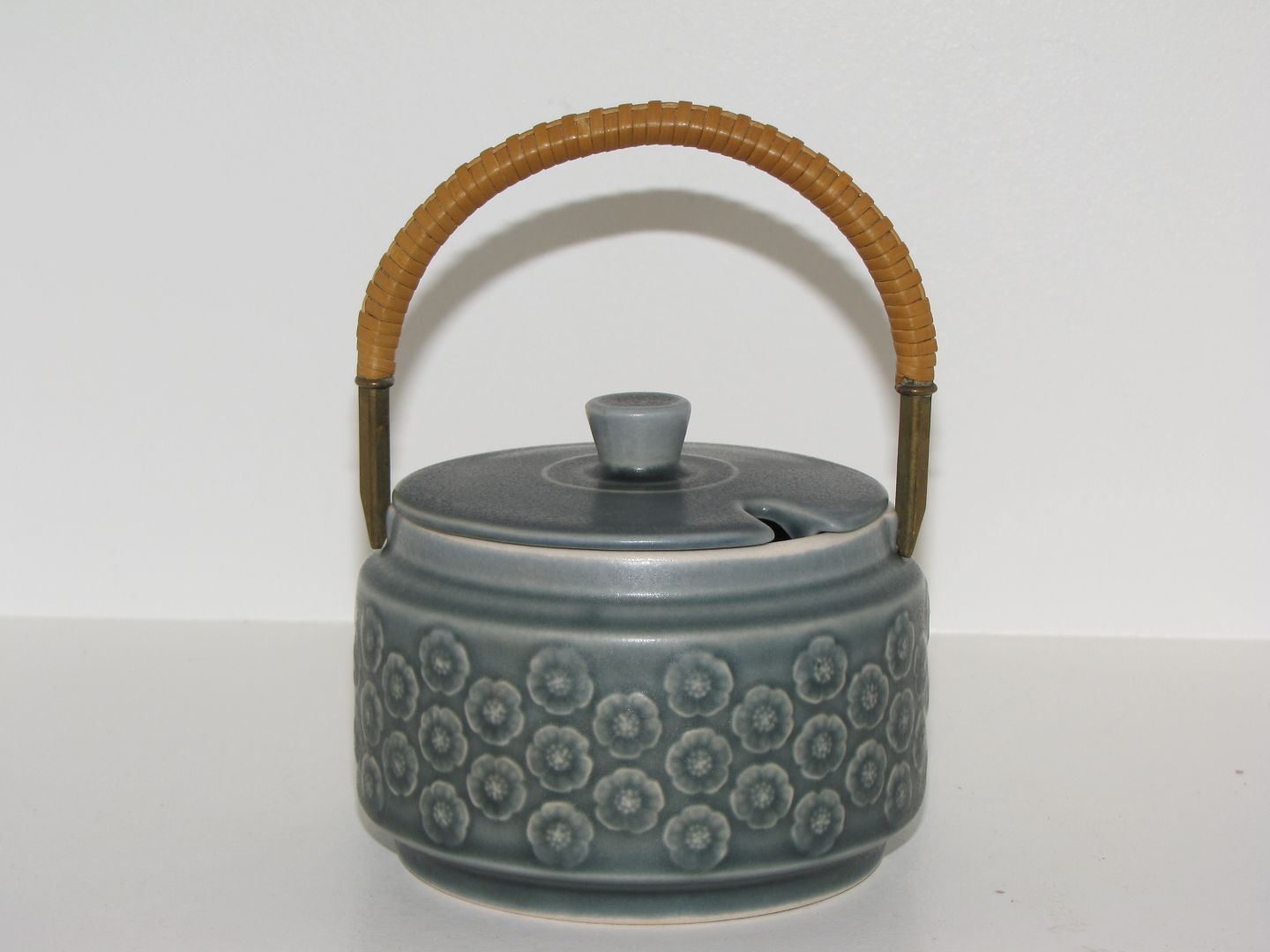 Kronjyden, Azur stentøj, marmeladekrukke med basthank. Designet af Jens Harald Quistgaard. Diameter 10,0 cm. Perfekt stand uden fejl.