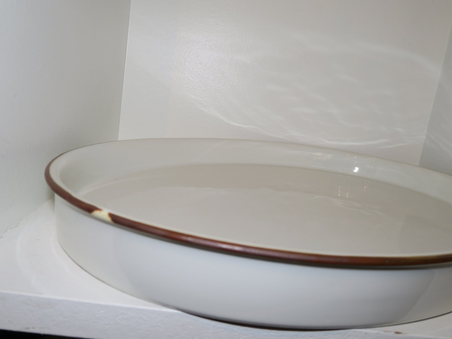 Royal Copenhagen Domino, stort stegefad. 3. sortering pga. brændingsfejl på kanten, se foto. Længde 36,0 cm. Perfekt stand uden fejl.