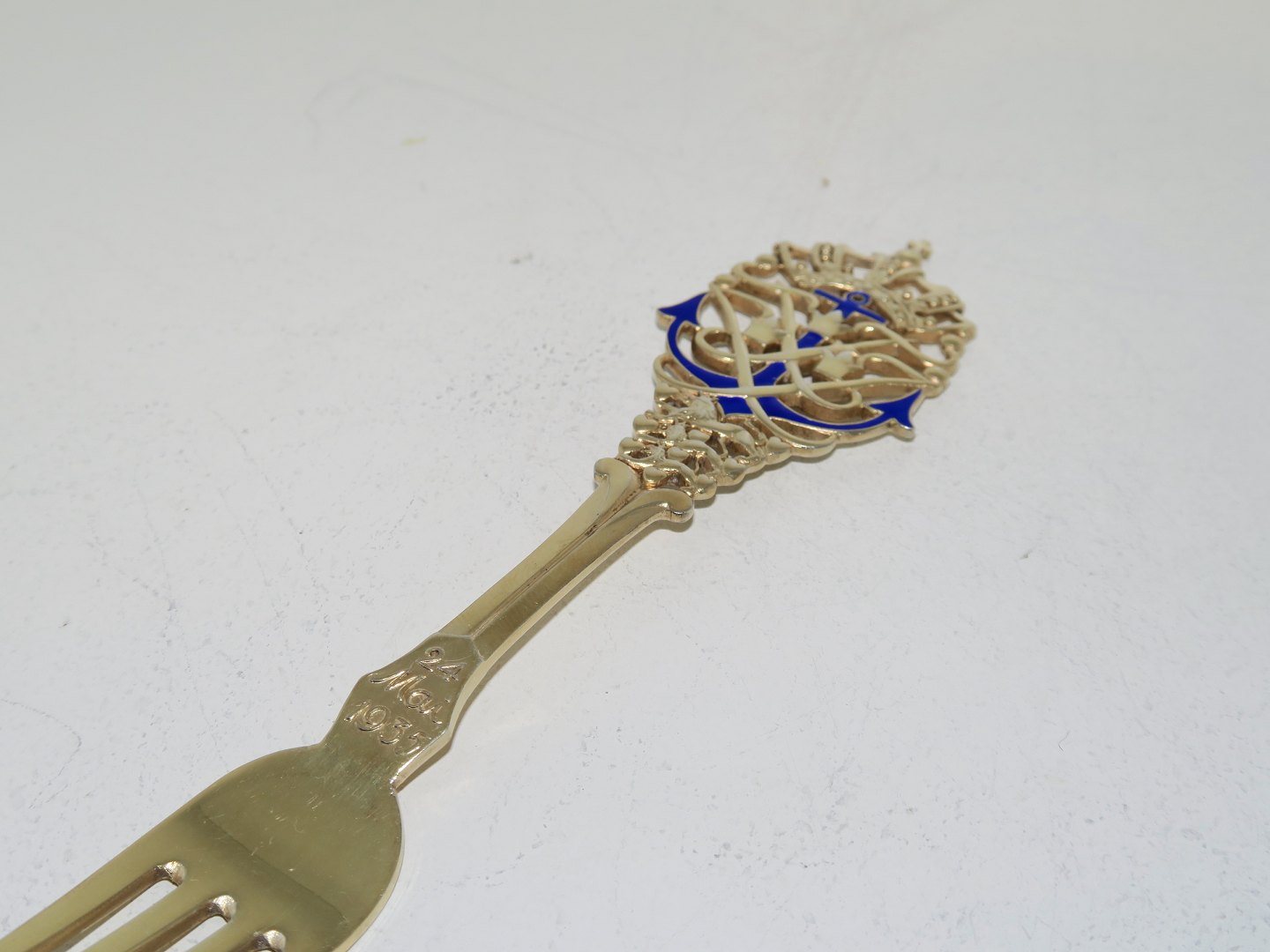 Anton Michelsen guilded sterling silver, commemorative fork from 1935. The wedding of Crown Prince Frederik and Princess Ingrid on May 24th. 1935. Designed by Jens Ingwersen. Length 16.5 cm. Perfect condition.