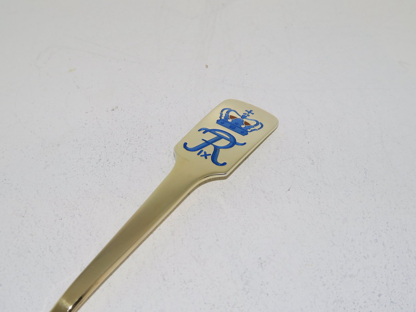 Michelsen forgyldt sterlingsølv, mindegaffel fra 1969. Mindegaffel i anledning af Kong Frederik IX's 70 års fødselsdag. Designet af Rigmor Andersen & Annalise Bjørner. Længde 16,3 cm. Fin og velholdt stand.