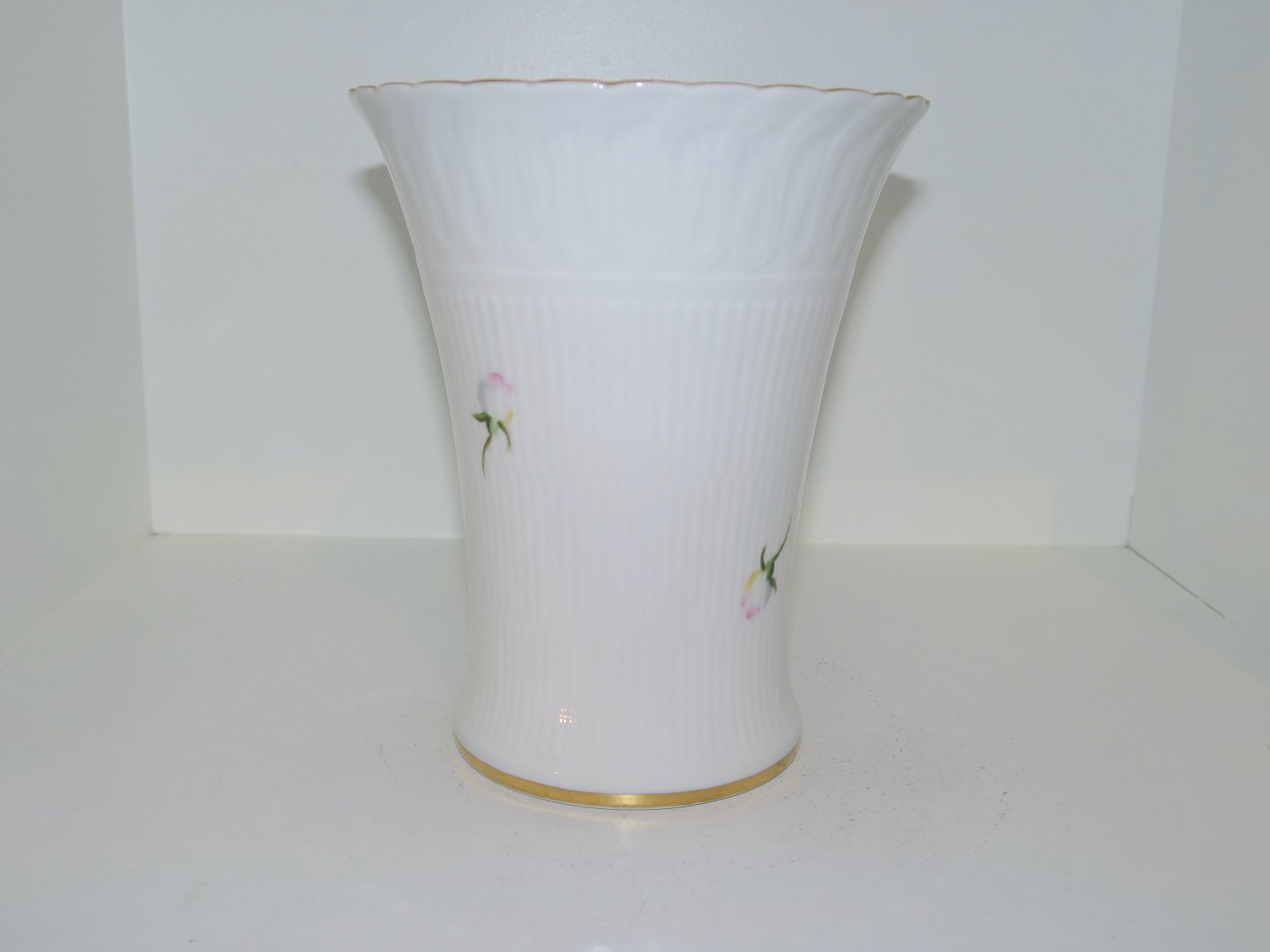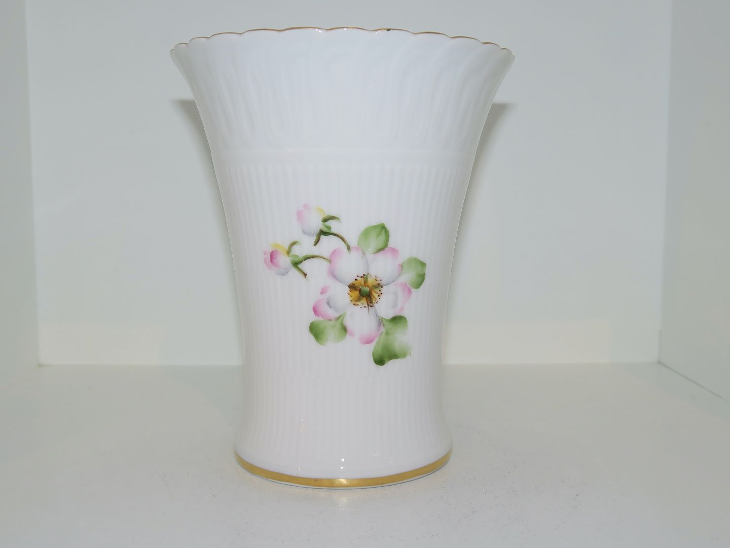 Bing & Grøndahl Prinsesse Margrethe stellet, vase med lyserøde æbleblomster. Af fabriksmærket ses det, at denne er produceret mellem 1915 og 1948. 1. sortering. Højde 16,0 cm., diameter 13,0 cm. Perfekt stand uden fejl.