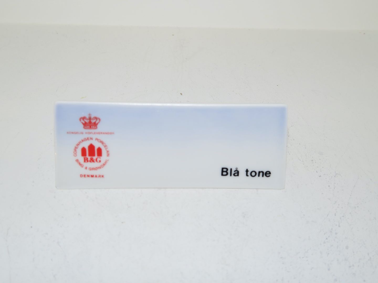 Bing & Grøndahl forhandlerskilt til stellet Blå Tone. Længde 10,0 cm., højde 4,0 cm. Der er et mini mini afslag på hjørnekanten foran ellers påerfekt stand.