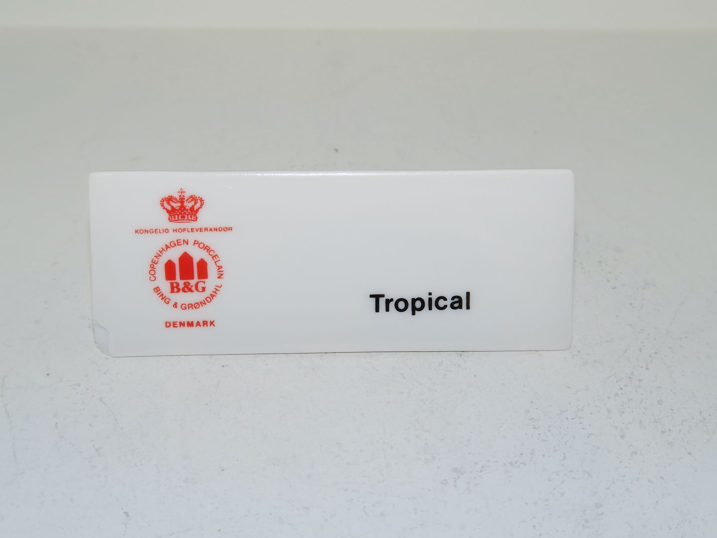 Bing & Grøndahl forhandlerskilt til stellet Tropical. Længde 10,0 cm., højde 4,0 cm. Der er er skår på forsiden på hjørnet, se foto, ellers perfekt stand.