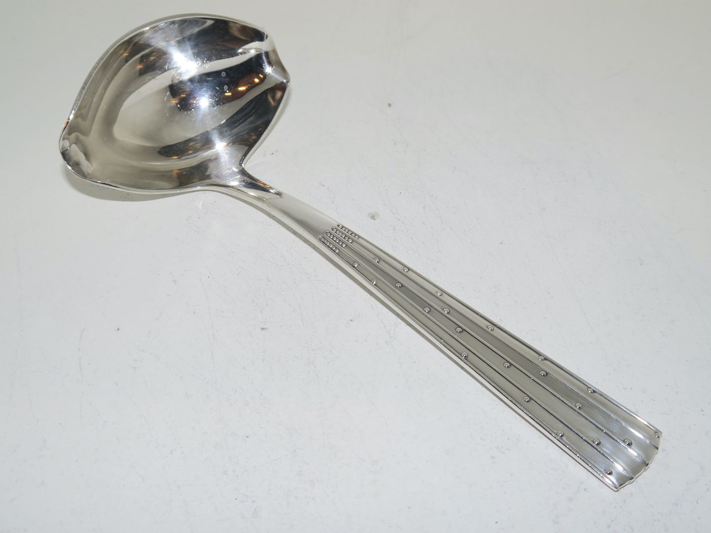 Champagne sølv, sovseske helt i sølv. Designet af Jens Harald Quistgaard og udført hos sølvsmed O.V. Mogensen. Længde 16,4 cm. Perfekt stand uden indgraveringer.