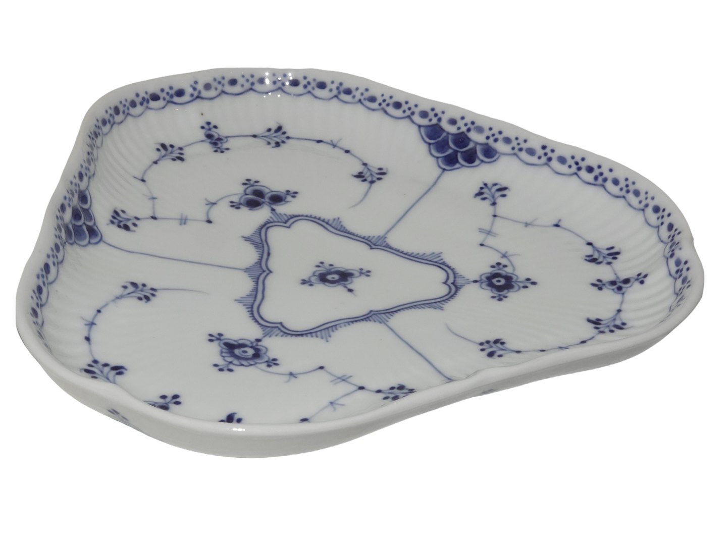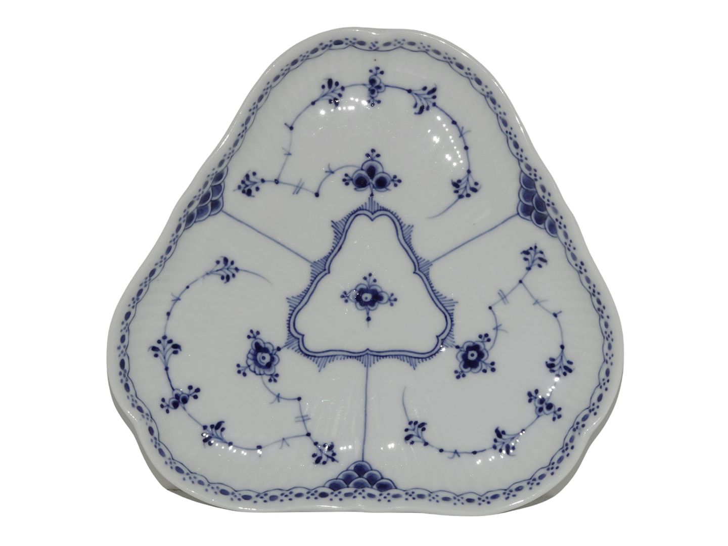 Royal Copenhagen Musselmalet Halvblonde, trekantet fad. Af fabriksmærket kan det udledes, at denne er produceret i 1951. Dekorationsnummer 1/515. 2. sortering. Måler 21 x 21 cm. Perfekt stand uden fejl.