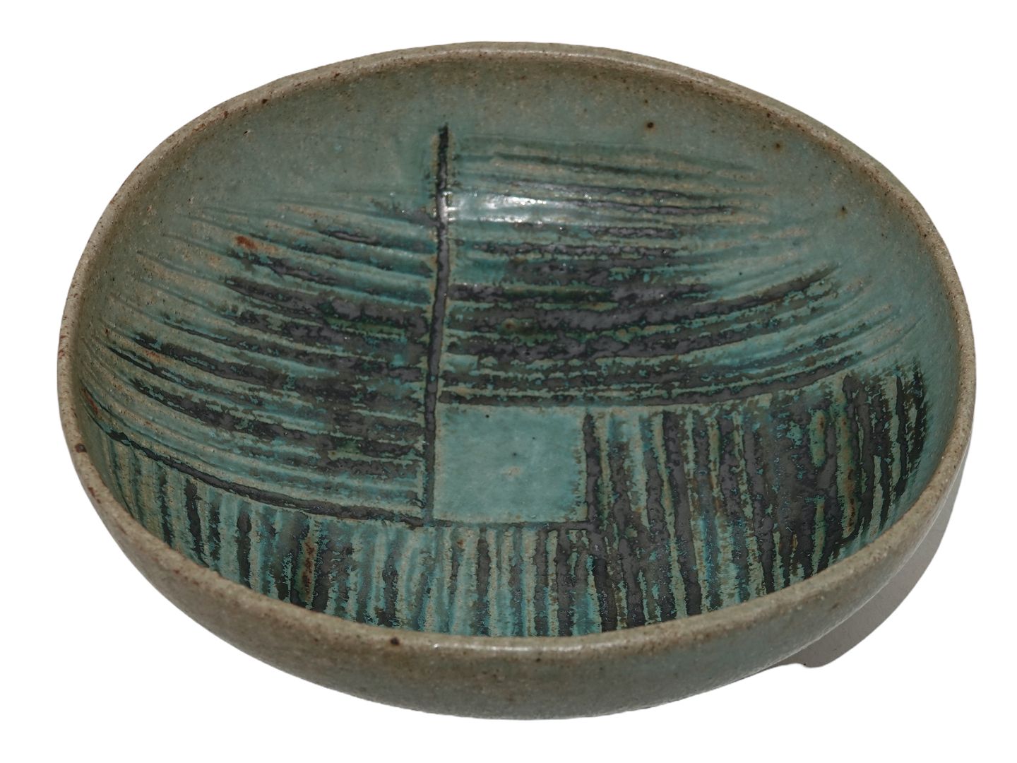 Saxbo keramik, ovalt fad med striber. Designet af Eva Stæhr Nielsen. Designnummer 252. Måler 19,0 x 16,5 cm. Perfekt stand.