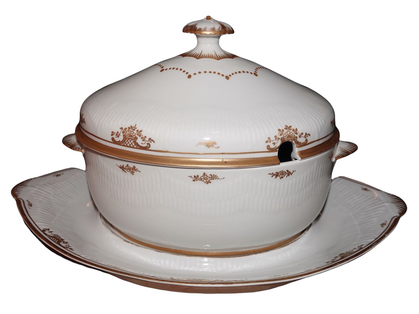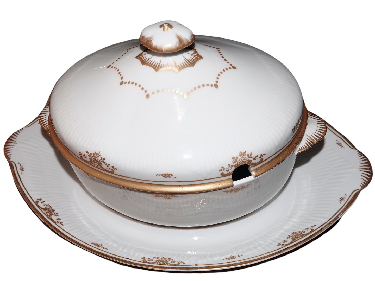 Royal Copenhagen Guldkurv med Ornamenter og Små Blomster, suppeterrin med tilhørende underfad.